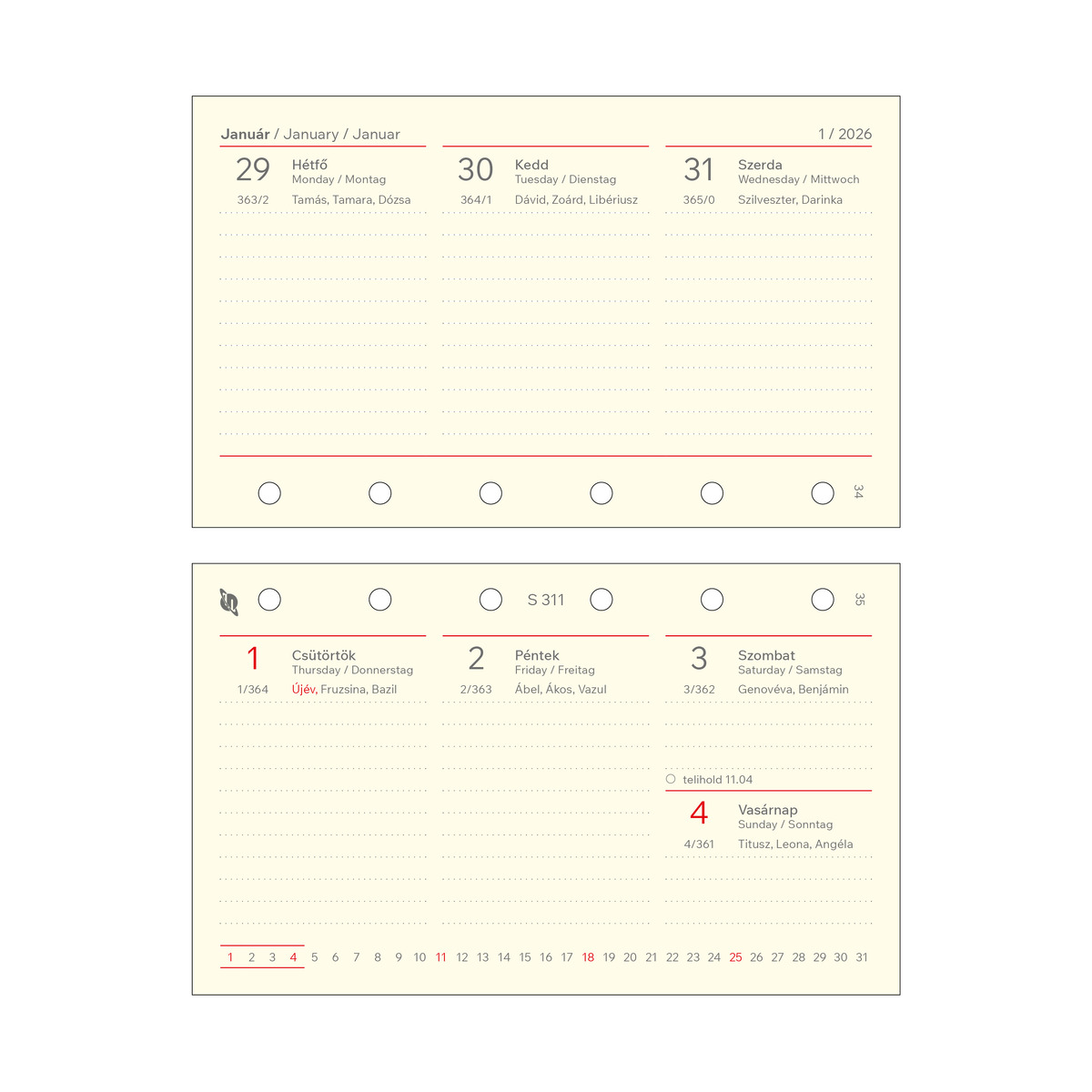 - Tartalom: Éves tervező leporelló, havi tervező naptár, a naplórész egy hét / oldalpár
