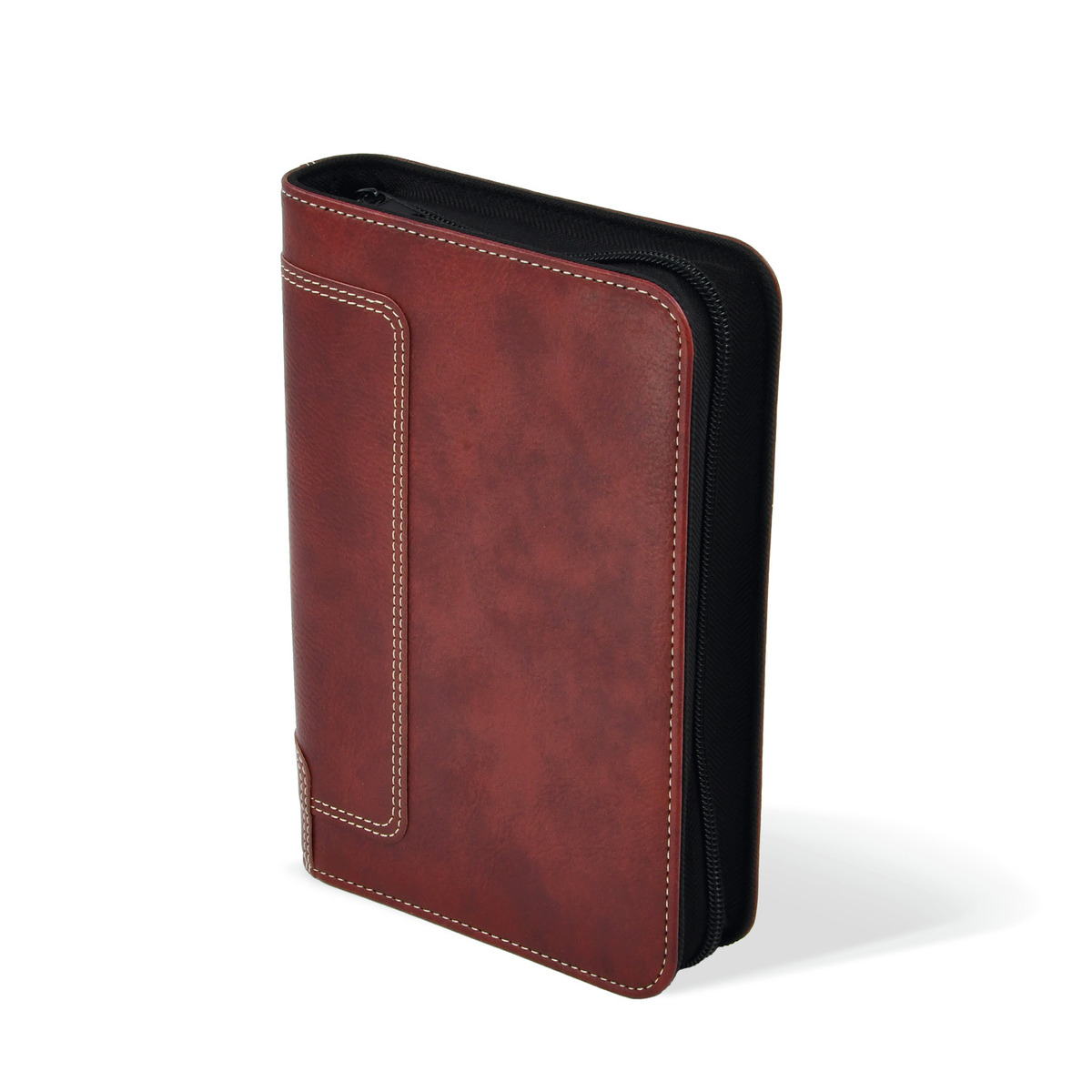 Sportos megjelenésű, prégelt felületű műbőrből, praktikus,cipzáras záródással készült, krém (Chamois) betétlapokkal töltött kalendárium.