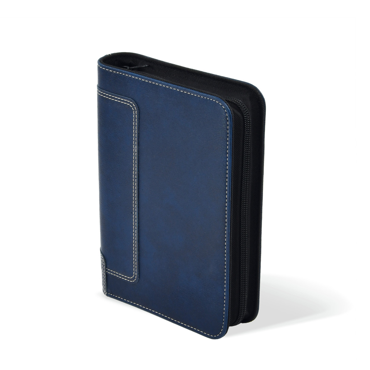 Sportos megjelenésű, prégelt felületű műbőrből, praktikus,cipzáras záródással készült, krém (Chamois) betétlapokkal töltött kalendárium.