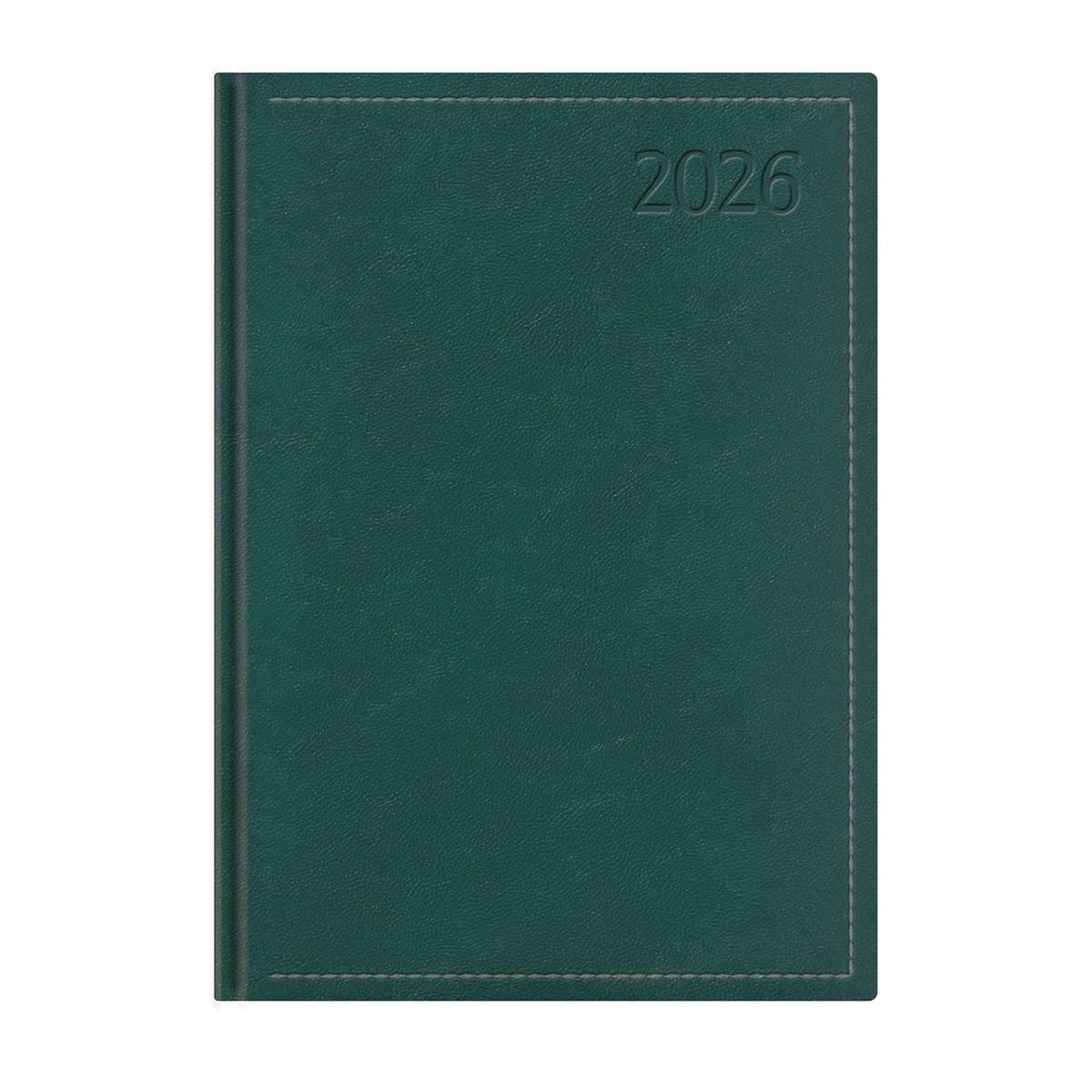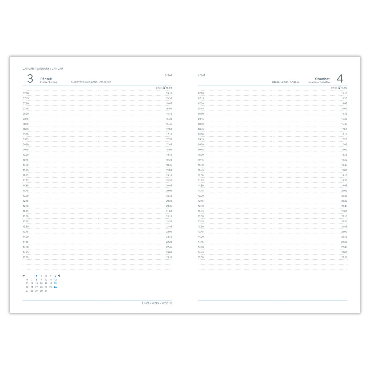 Fényes műbőr bevonóval készült, fehér tömbös napi beosztású naptár, jelzőszalaggal. Színes térképet tartalmaz.