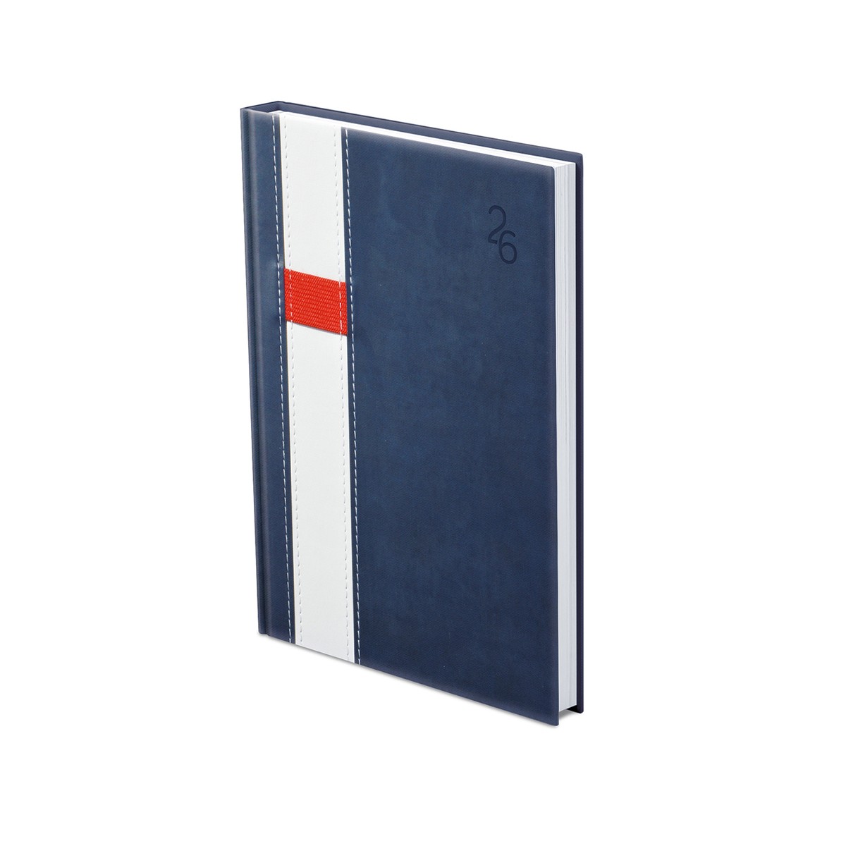 Kétféle, matt, bőrhatású és eltérő felületű, hőre színeződő műbőr bevonóval, varrással díszitett, gumis tolltartóval ellátott, fehér tömbös, heti beosztású naptár, jelzőszalaggal. Színes térképet tartalmaz.