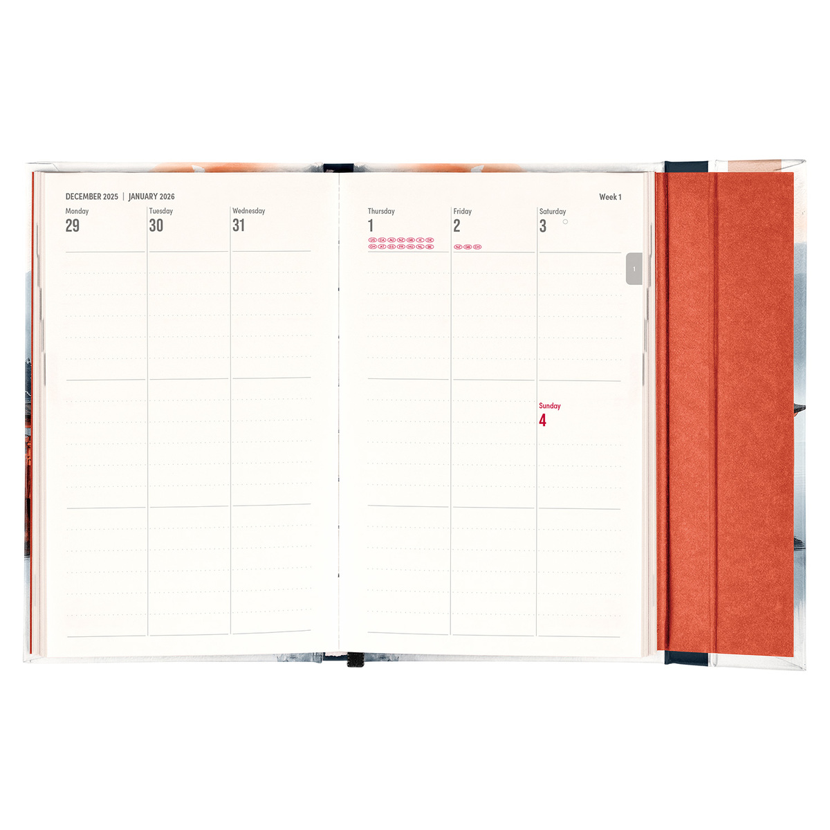 Keménytáblás naptár mágneszárral, heti tervező, jegyzetoldal blokk és belső papír tároló zsebbel.