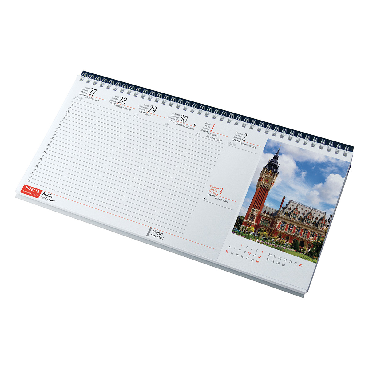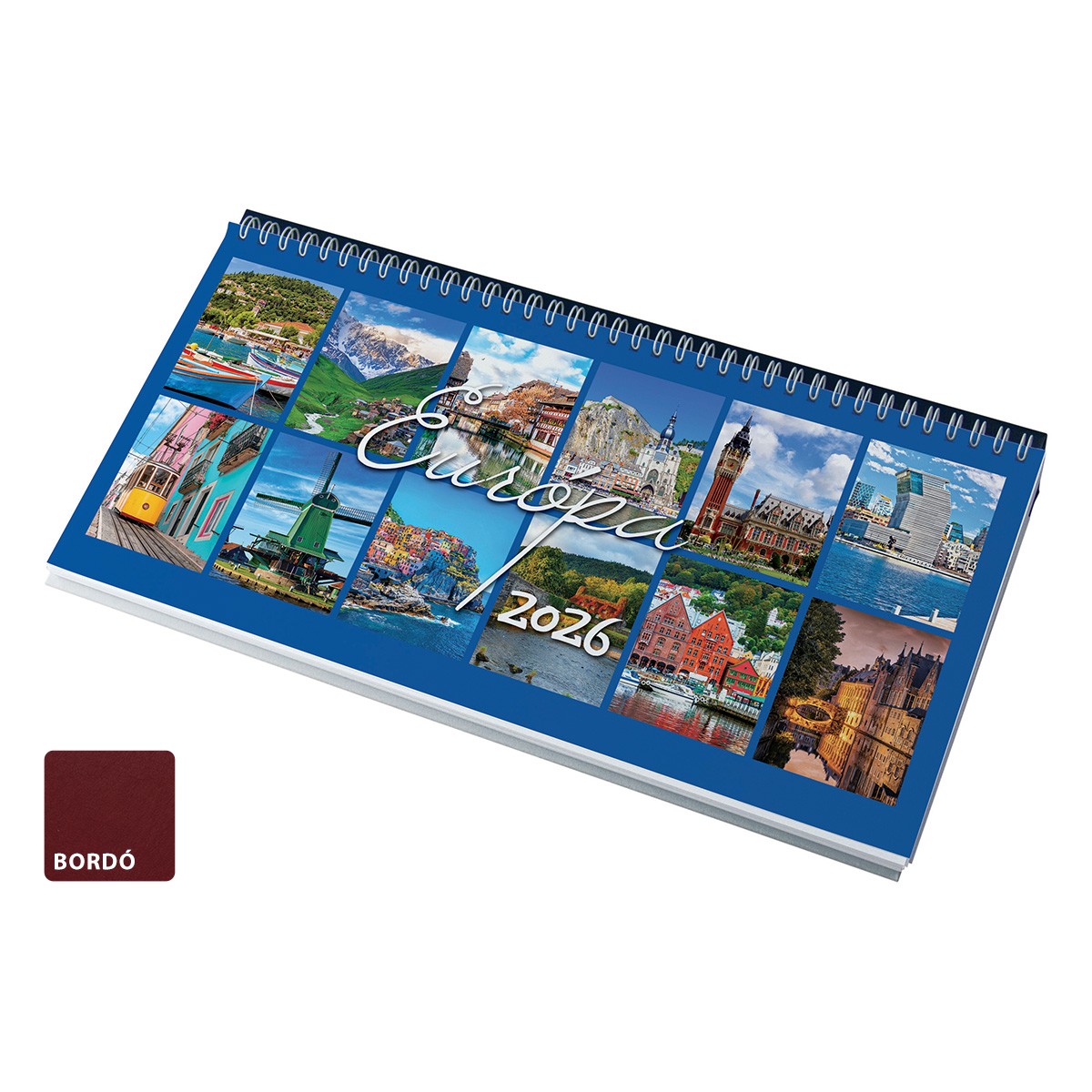 Ikerspirállal összefűzött, fehér lapos, fekvő asztali naptár