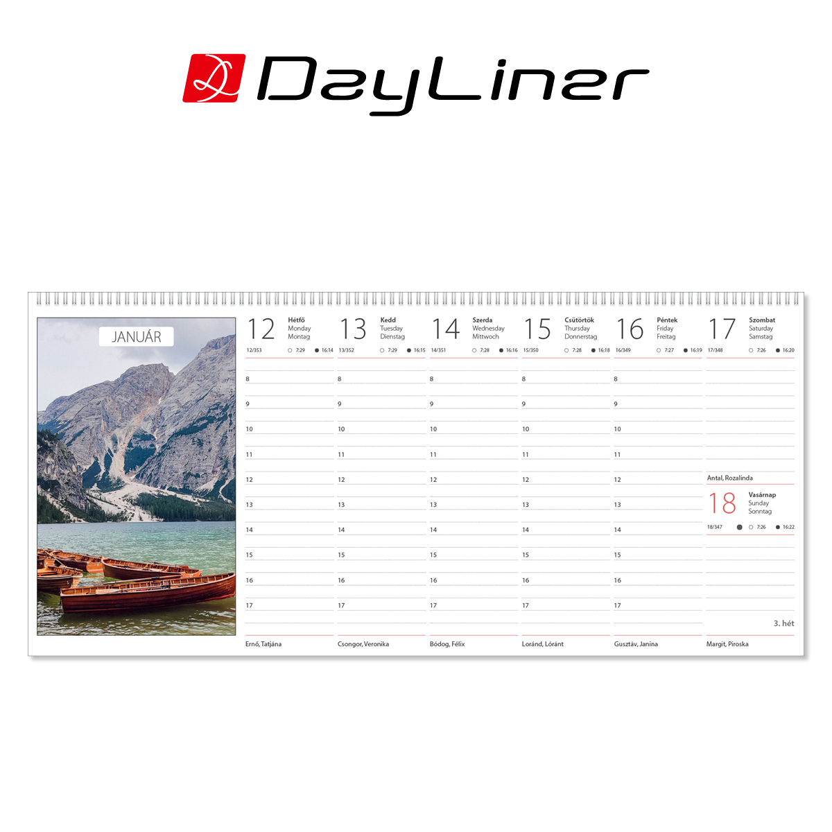 Magyar-angol-német nyelvű naptár, magyar ünnepek, névnapok.