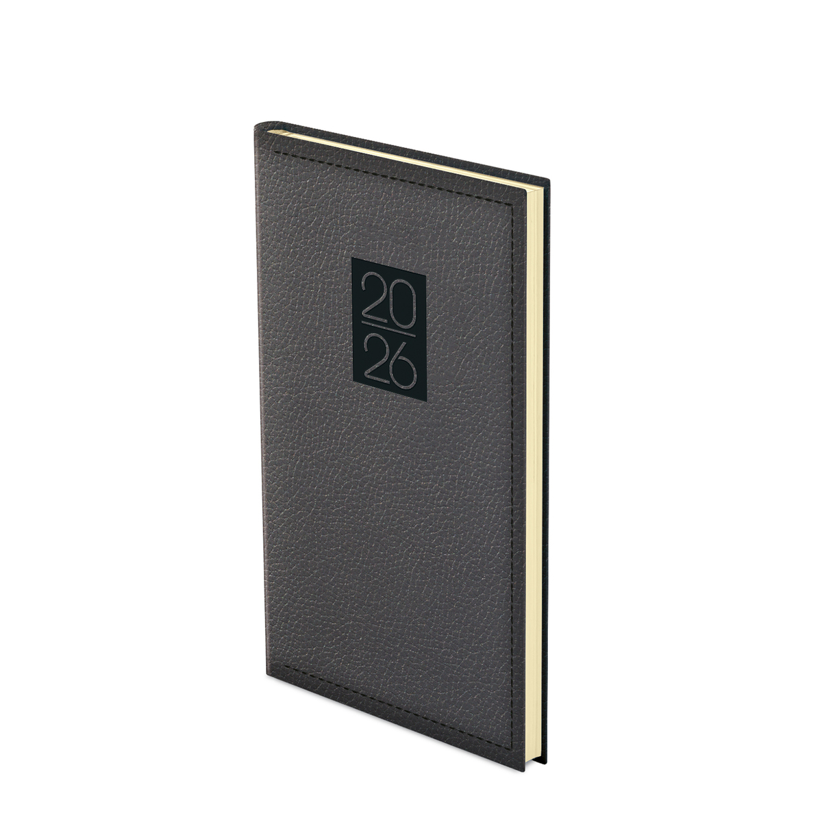 Prégelt, bőrhatású, hőre színeződő műbőr bevonóval, díszkerettel és elegáns évszámmal ellátott, chamois (krémszínű) tömbös fekvő zsebnaptár, színes oromszegővel és jelzőszalaggal. Színes térképet tartalmaz.