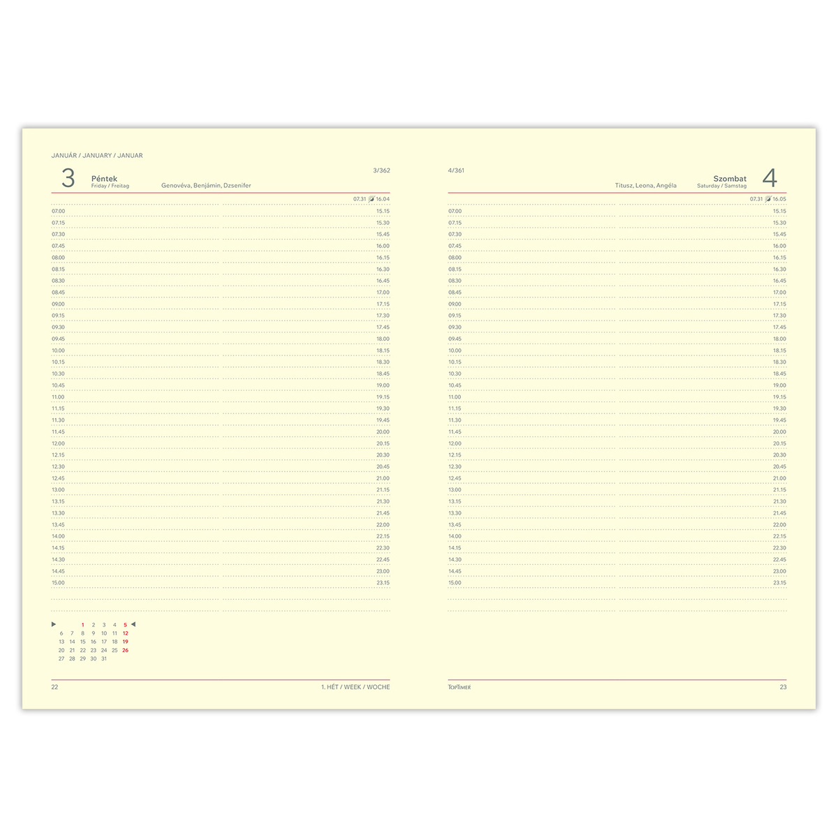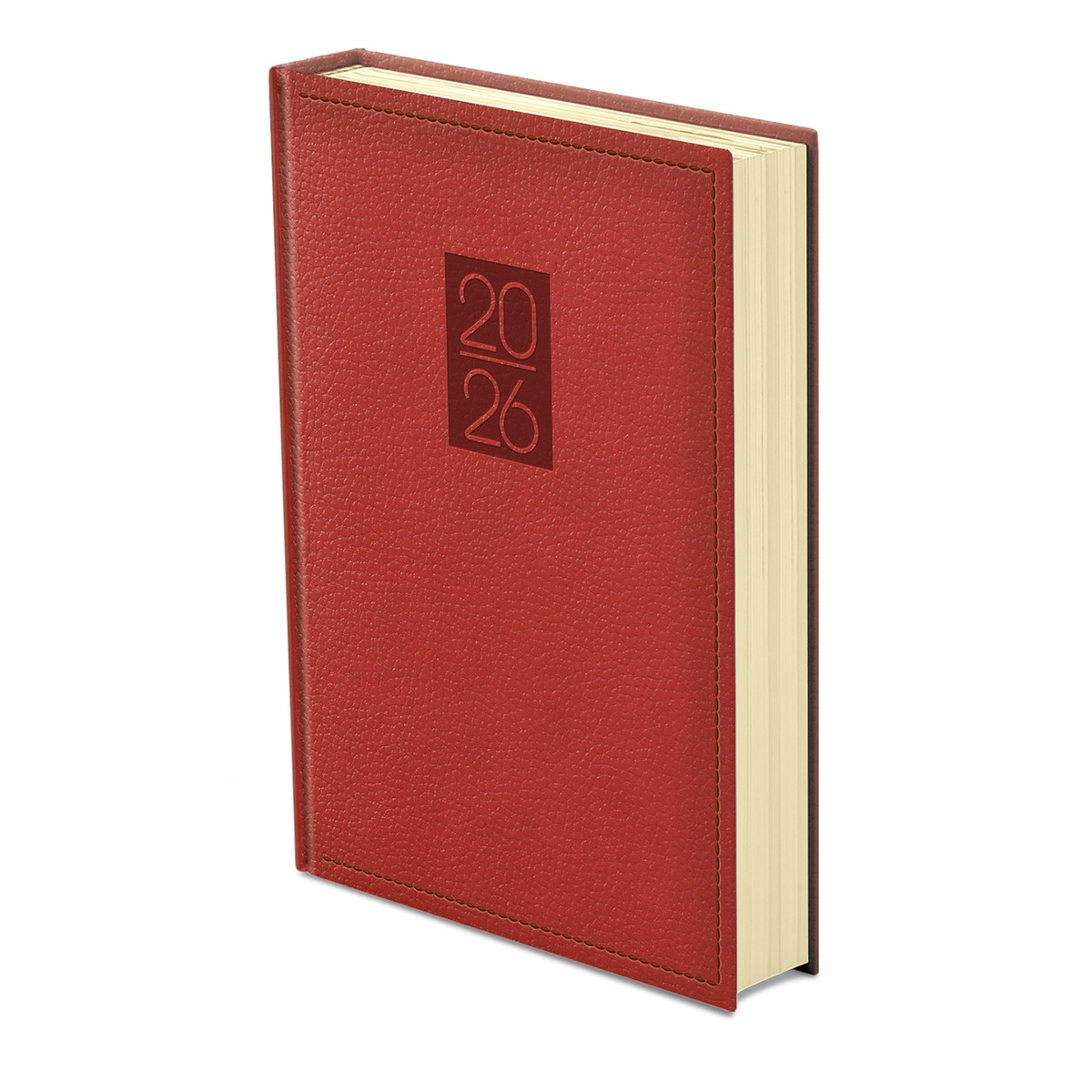 Prégelt, bőrhatású, hőre színeződő műbőr bevonóval, díszkerettel és elegáns évszámmal ellátott, chamois (krémszínű) tömbös napi beosztású naptár, színes oromszegővel, jelzőszalaggal és sarokperforációval. Elöl-hátul szivacsos fedlap, cérnafűzéssel. Színes térképet tartalmaz.
