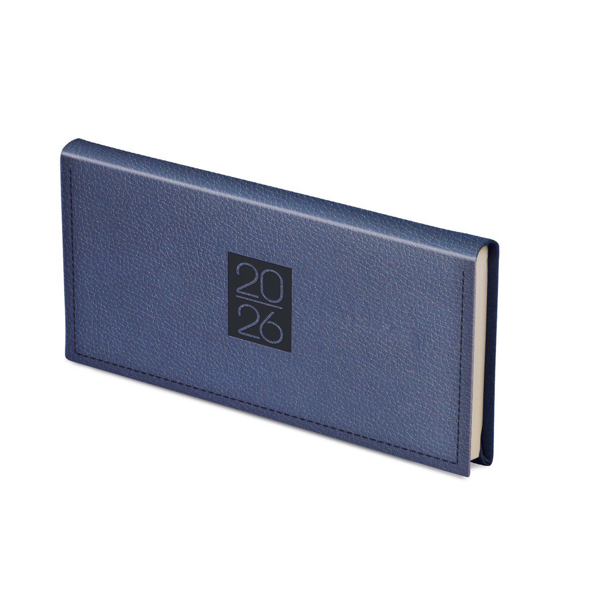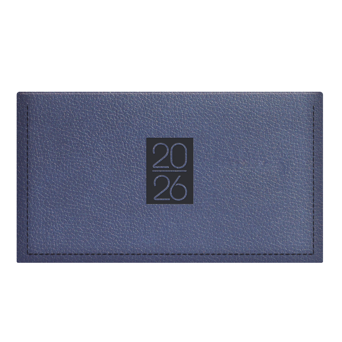 Prégelt, bőrhatású, hőre színeződő műbőr bevonóval, díszkerettel és elegáns évszámmal ellátott, chamois (krémszínű) tömbös fekvő zsebnaptár, színes oromszegővel és jelzőszalaggal. Színes térképet tartalmaz.
