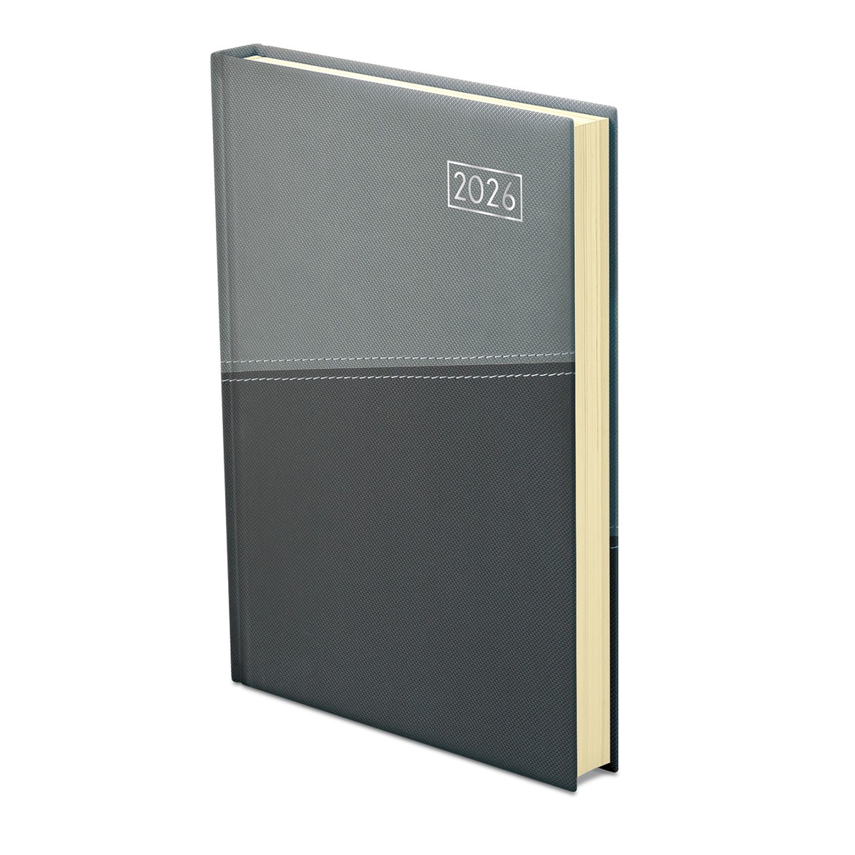 Matt, hőre színeződő műbőr bevonóval, keresztirányú varrással készített, chamois (krémszínű) tömbös napi beosztású naptár, színes oromszegővel, jelzőszalaggal és sarokperforációval. Elöl-hátul szivacsos fedlap. Színes térképet tartalmaz.