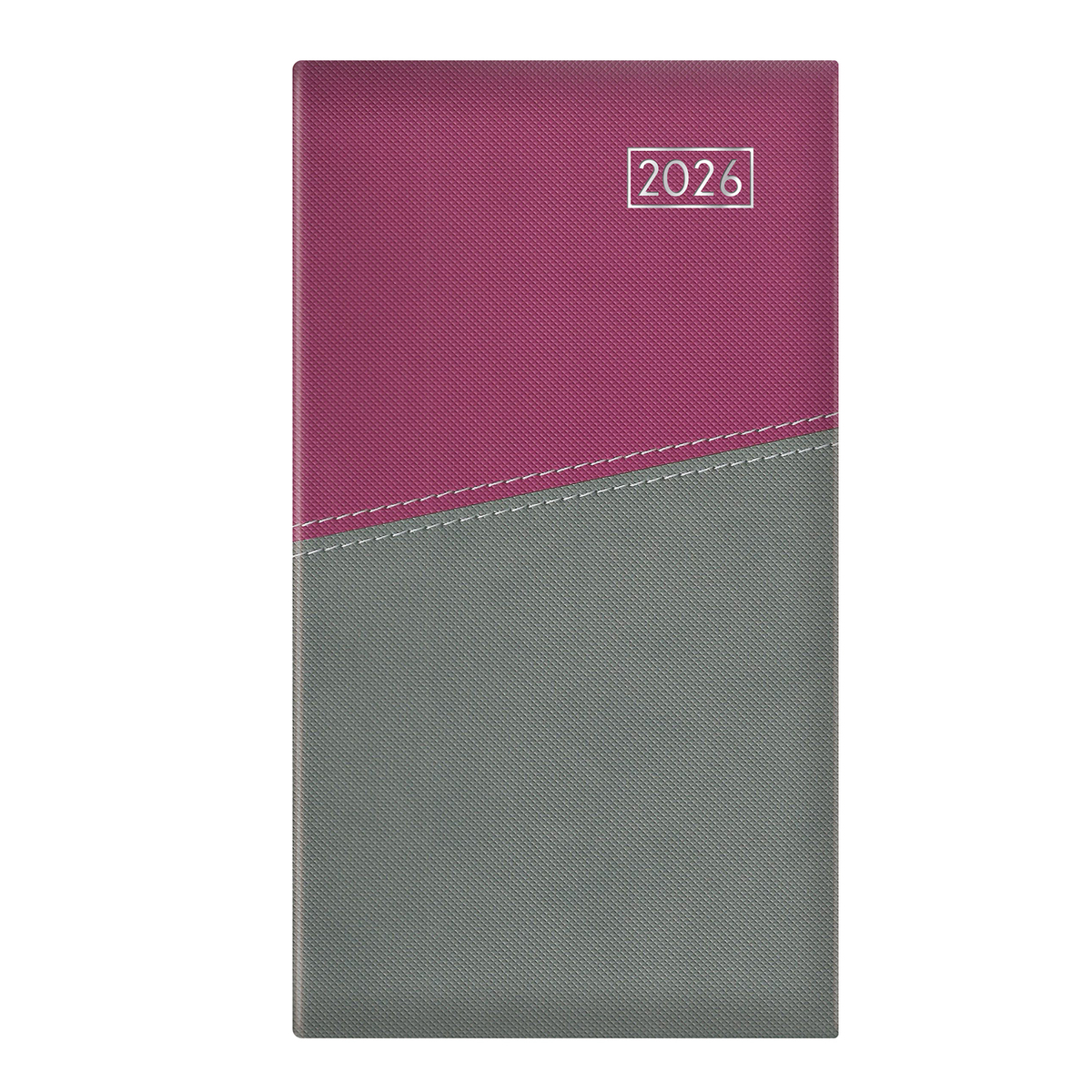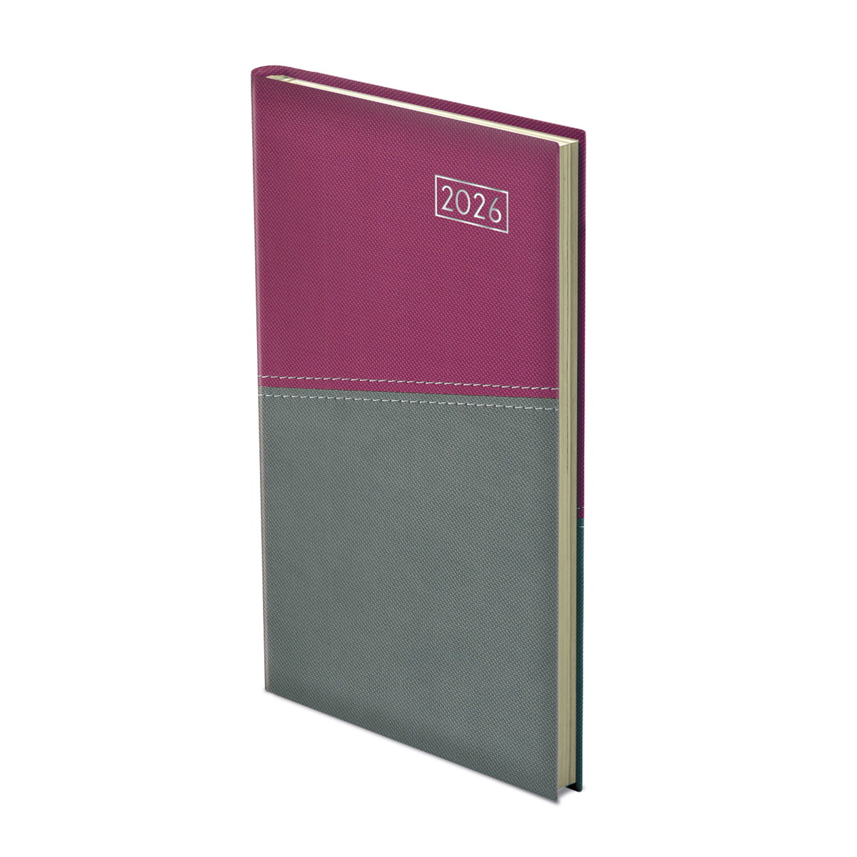 Matt, hőre színeződő műbőr bevonóval, keresztirányú varrással készített, chamois (krémszínű) tömbös, álló zsebnaptár, színes oromszegővel, jelzőszalaggal. Színes térképet tartalmaz.