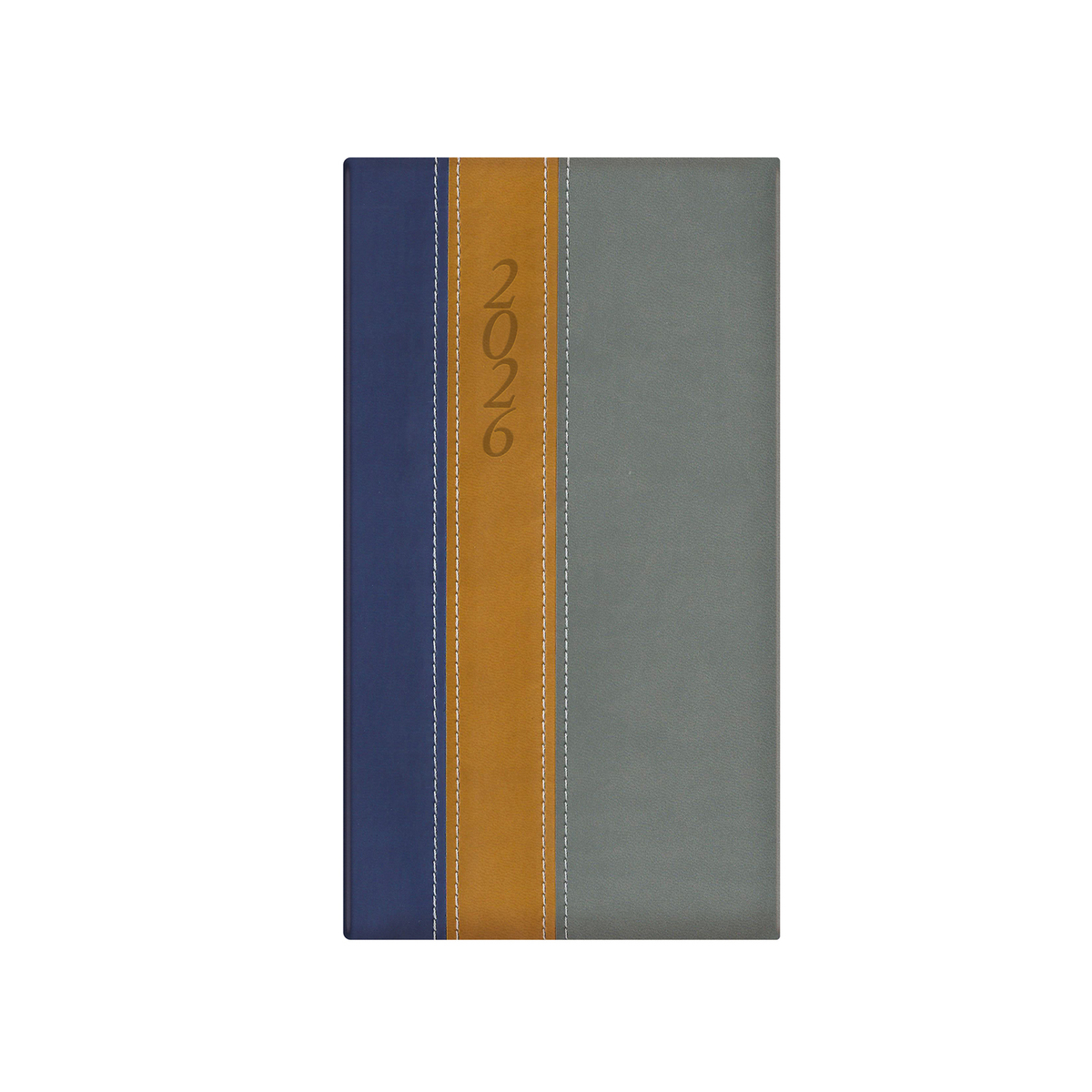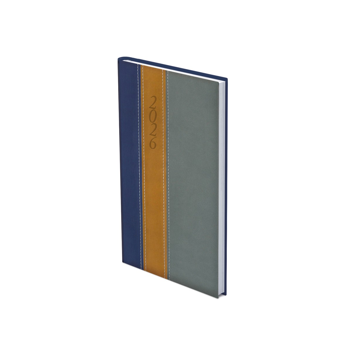 Kétféle, matt, bőrhatású és eltérő felületű, hőre színeződő műbőr bevonóval, varrással díszített, fehér tömbös álló zsebnaptár, jelzőszalaggal. Színes térképet tartalmaz.