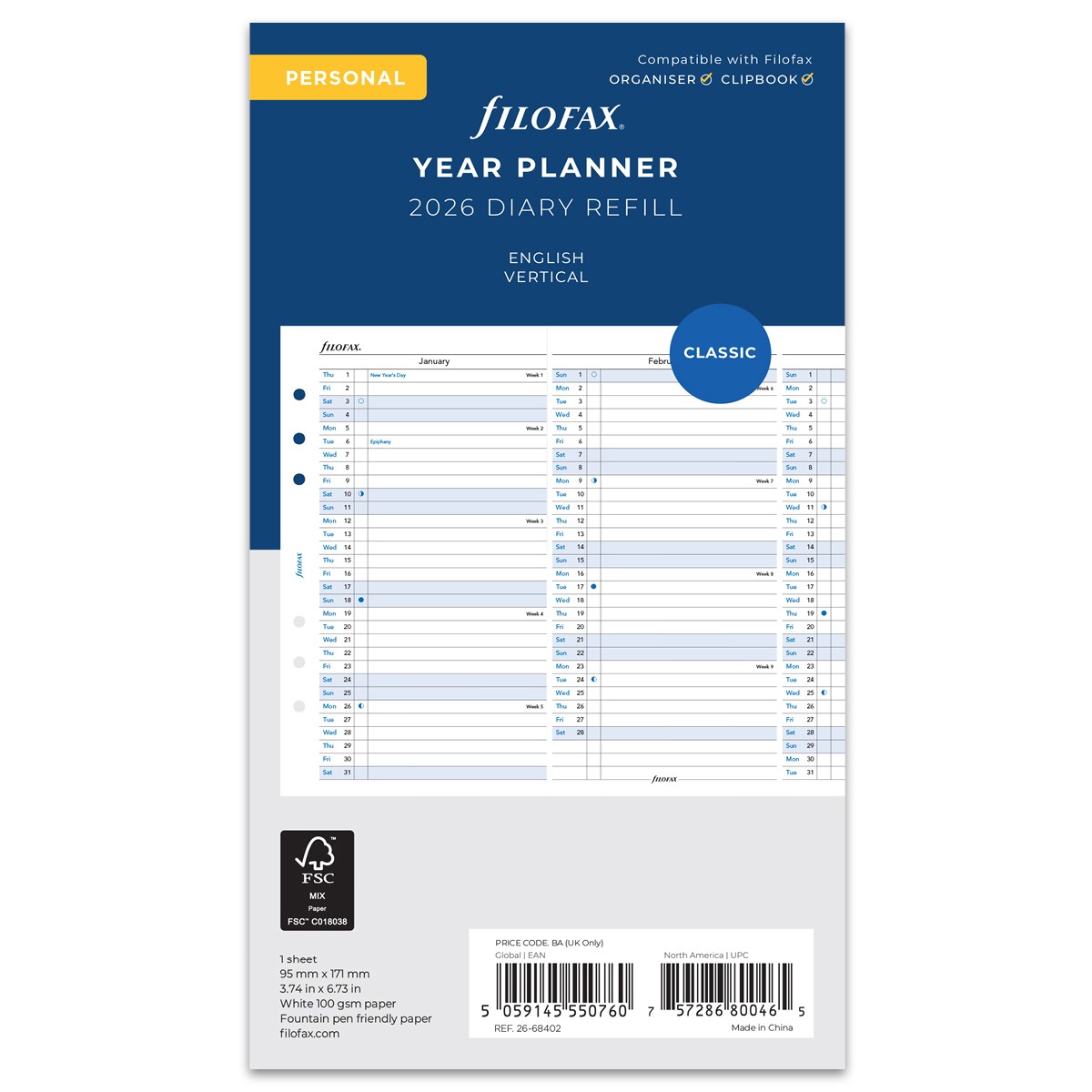 Filofax Naptárbetét Éves Vertikális Personal Fehér 2026
