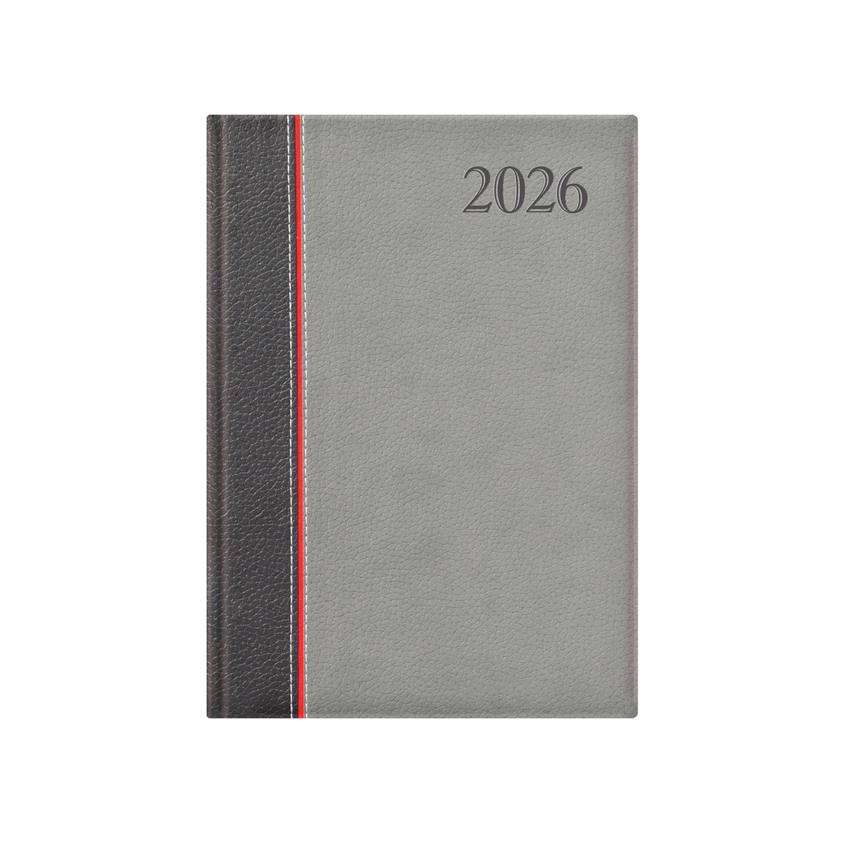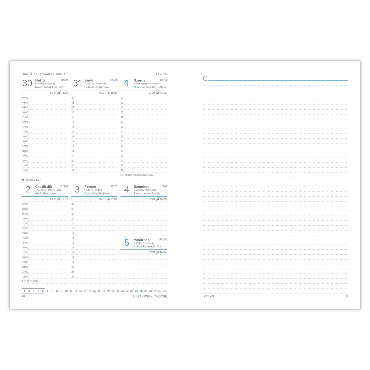 Matt, bőrhatású, hőre színeződő műbőr bevonóval, függőleges díszítő csík bevarrásával készült, fehér tömbös, heti beosztású naptár, jelzőszalaggal és sarokperforációval. Elöl-hátul szivacsos fedlap. Színes térképet tartalmaz.