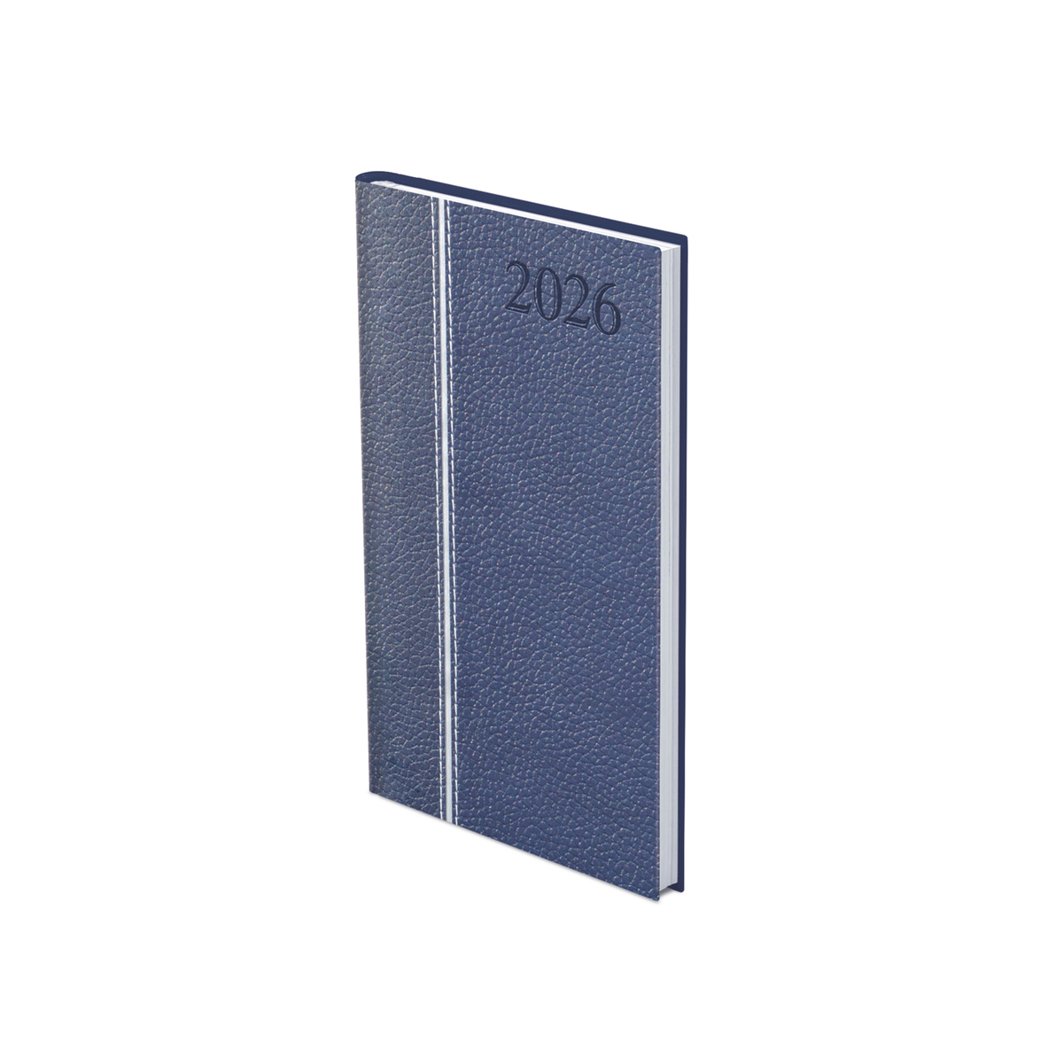 Matt, bőrhatású, hőre színeződő műbőr bevonóval, függőleges díszítő csík bevarrásával készült, fehér tömbös, álló zsebnaptár, jelzőszalaggal. Színes térképet tartalmaz.