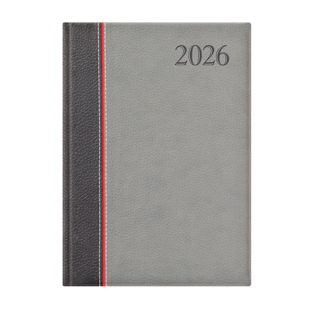 Matt, bőrhatású, hőre színeződő műbőr bevonóval, függőleges díszítő csík bevarrásával készült, fehér tömbös heti beosztású naptár, jelzőszalaggal és sarokperforációval. Elöl-hátul szivacsos fedlap. Színes térképet tartalmaz.