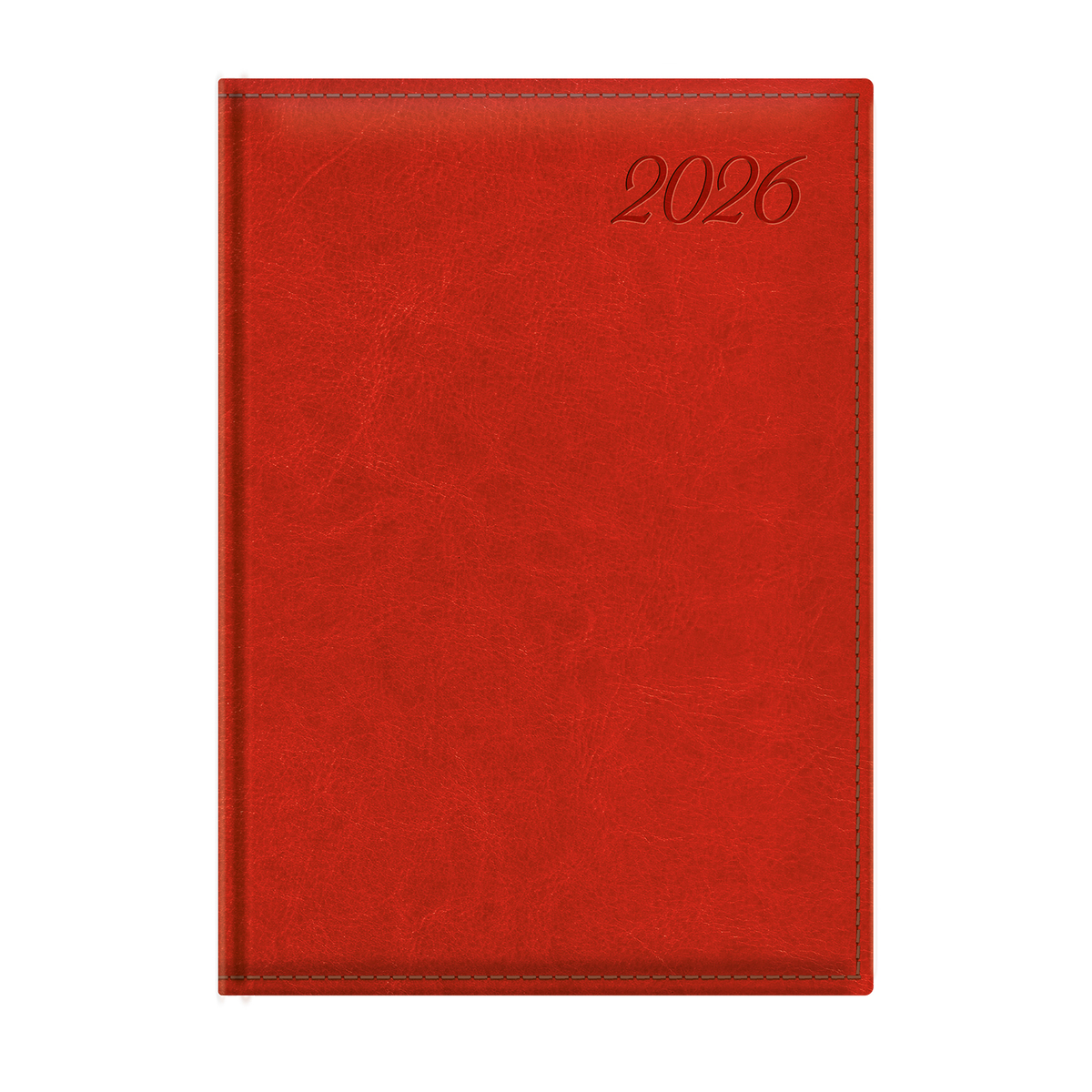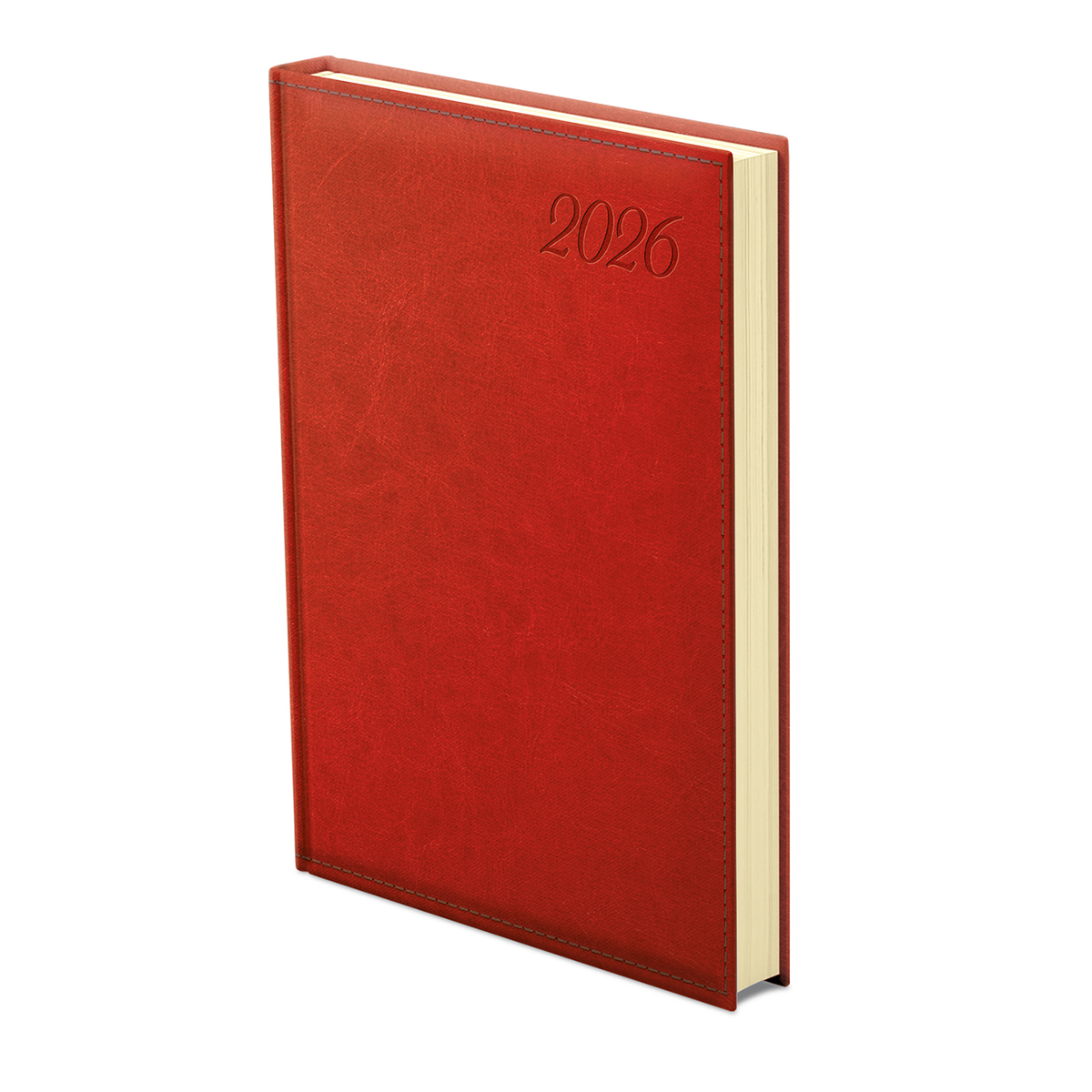 Magas fényű, bőrhatású, hőre színeződő műbőr bevonóval, varrott kerettel és légies évszámmal készített, chamois (krémszínű) tömbös napi beosztású naptár, színes oromszegővel, jelzőszalaggal és sarokperforációval. Elöl-hátul szivacsos fedlap. Színes térképet tartalmaz.
