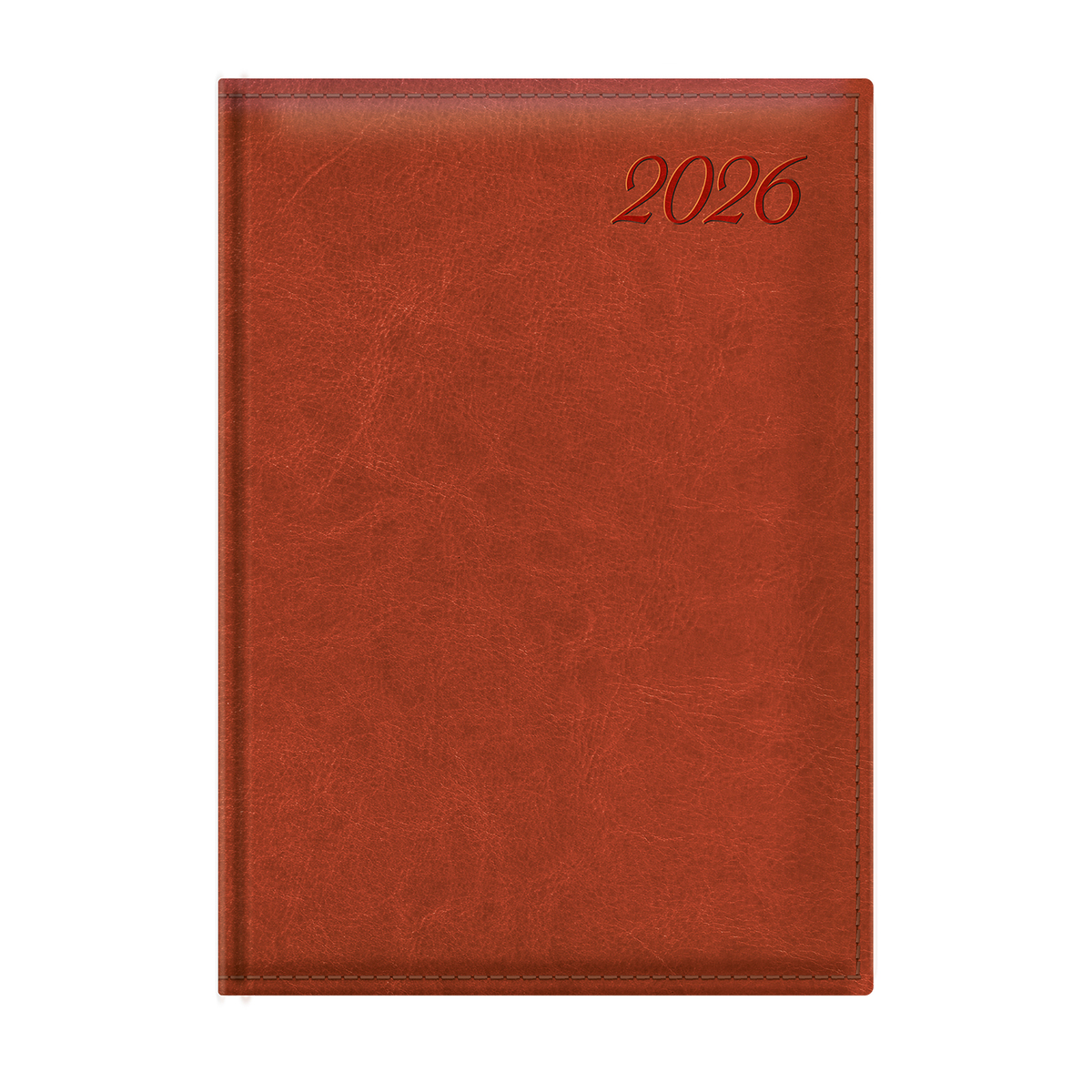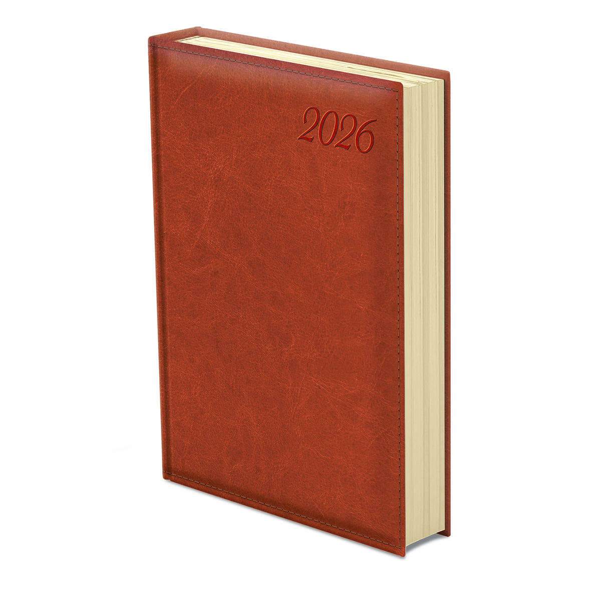 Magas fényű, bőrhatású, hőre színeződő műbőr bevonóval, varrott kerettel és légies évszámmal készített, chamois (krémszínű) tömbös napi beosztású naptár, színes oromszegővel, jelzőszalaggal és sarokperforációval. Elöl-hátul szivacsos fedlap. Színes térképet tartalmaz.