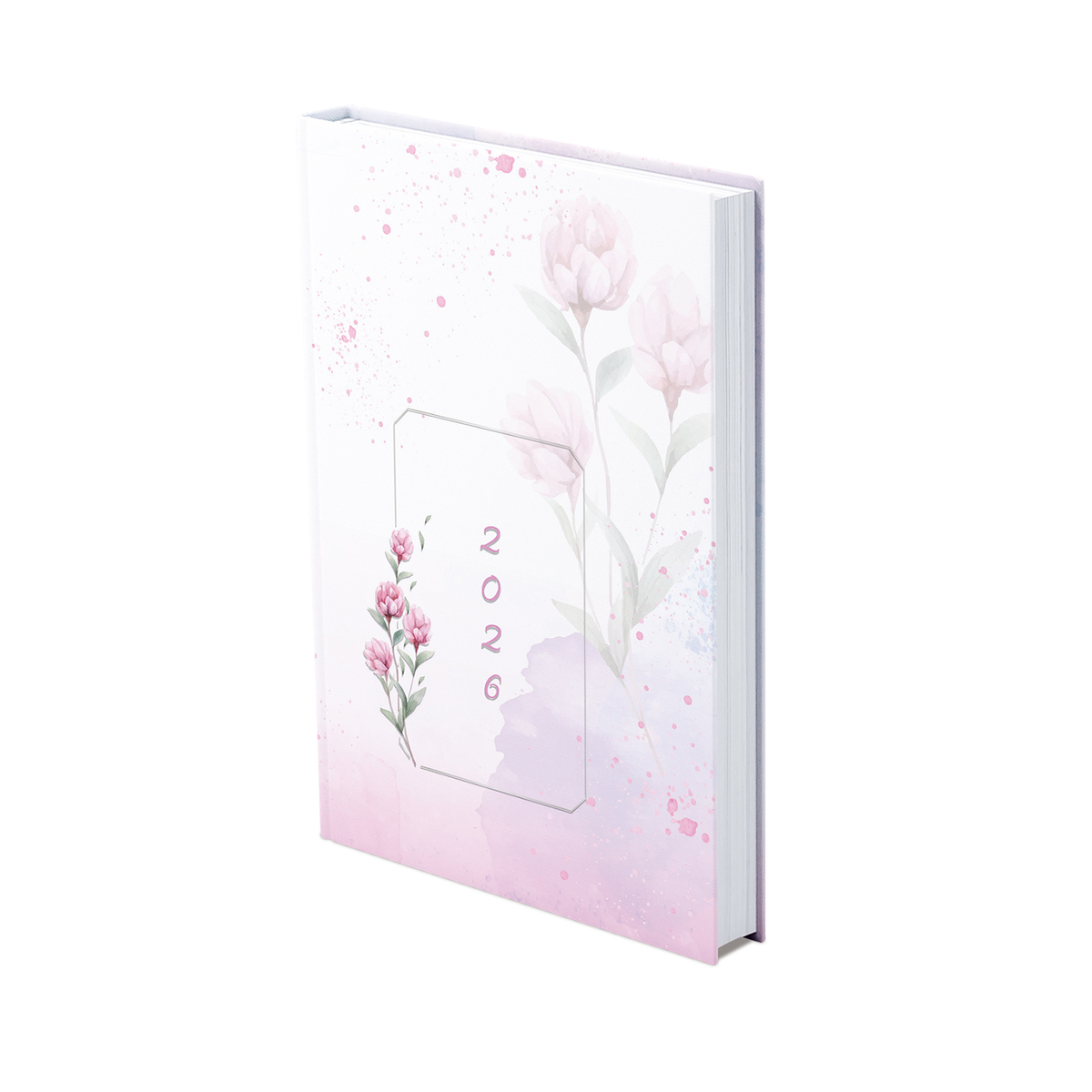 Színes grafikával díszített, matt fóliával bevont, sarokkerekített fehér tömbös, napi beosztású naptár, jelzőszalaggal.