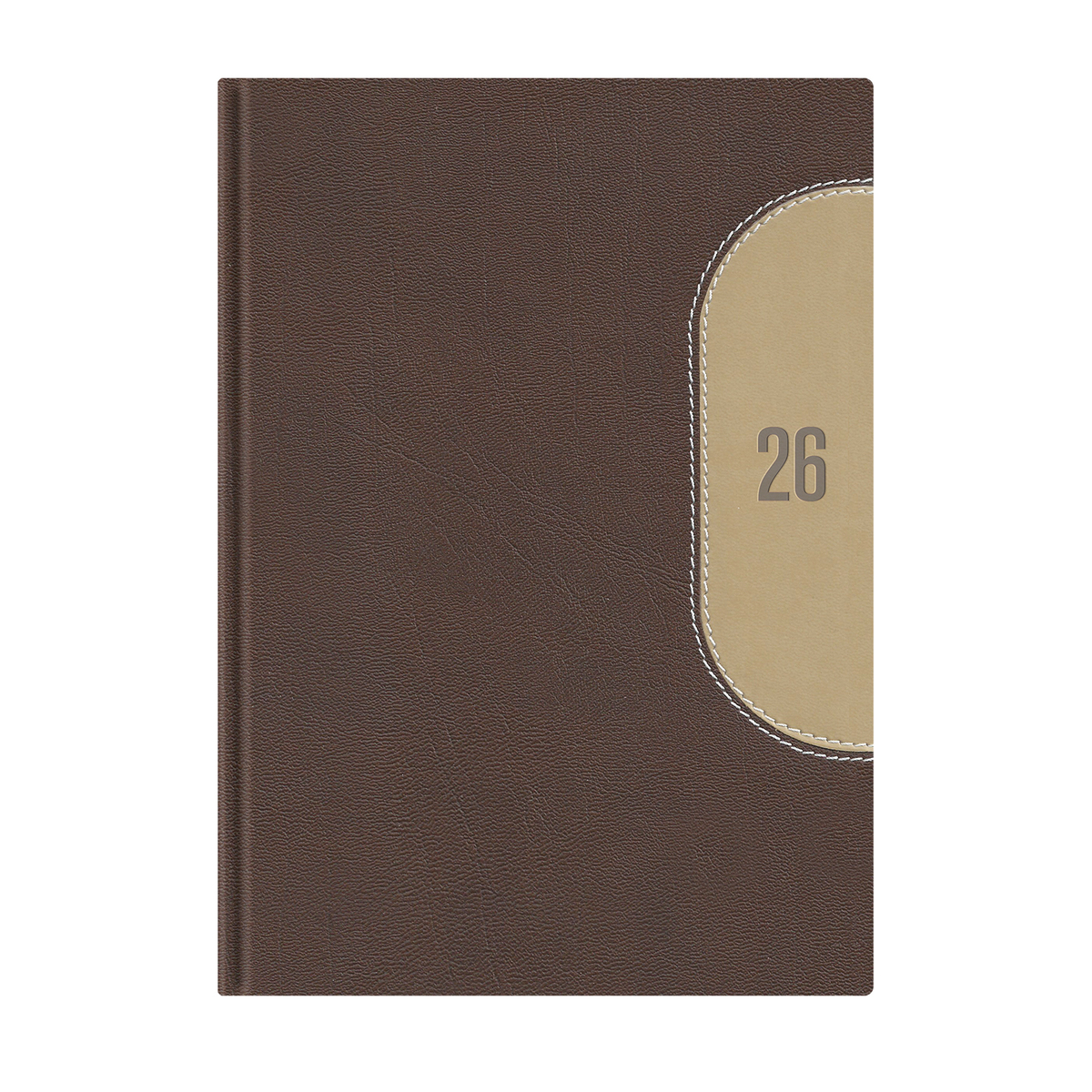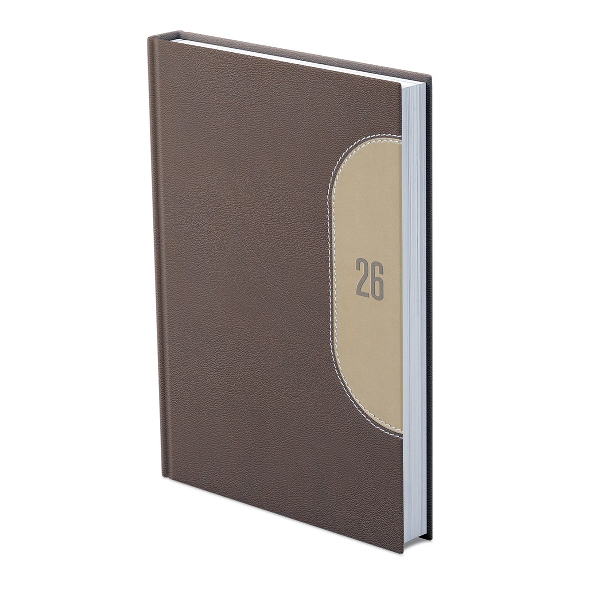 Kétféle, matt bőrhatású, hőre színeződő műbőrből, különleges varrott betéttel díszített, fehér tömbös napi beosztású naptár, jelzőszalaggal és sarokperforációval. Elöl-hátul szivacsos fedlap. Színes térképet tartalmaz.