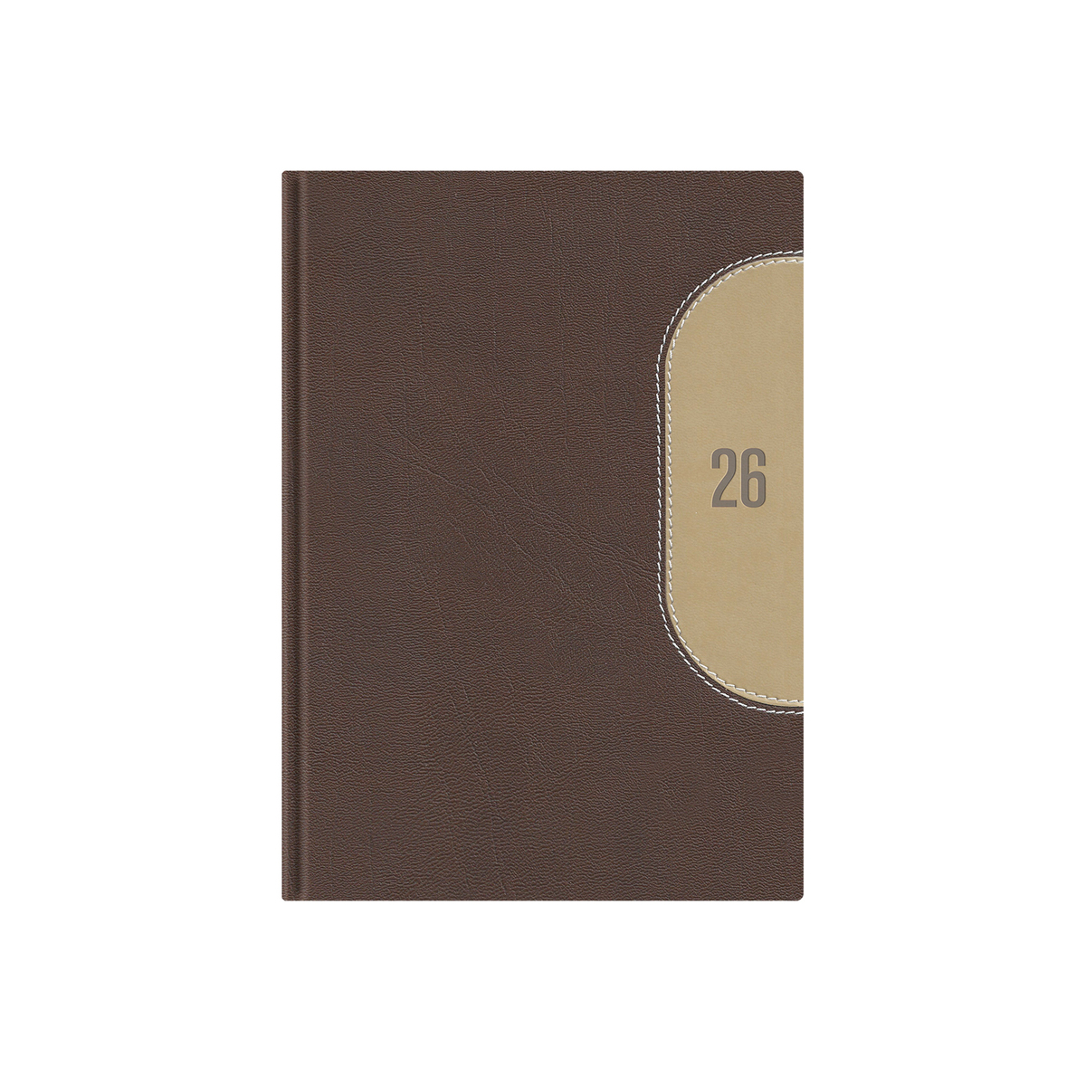 Kétféle, matt bőrhatású, hőre színeződő műbőrből, különleges varrott betéttel díszített, fehér tömbös, heti beosztású naptár, jelzőszalaggal és sarokperforációval. Színes térképet tartalmaz.