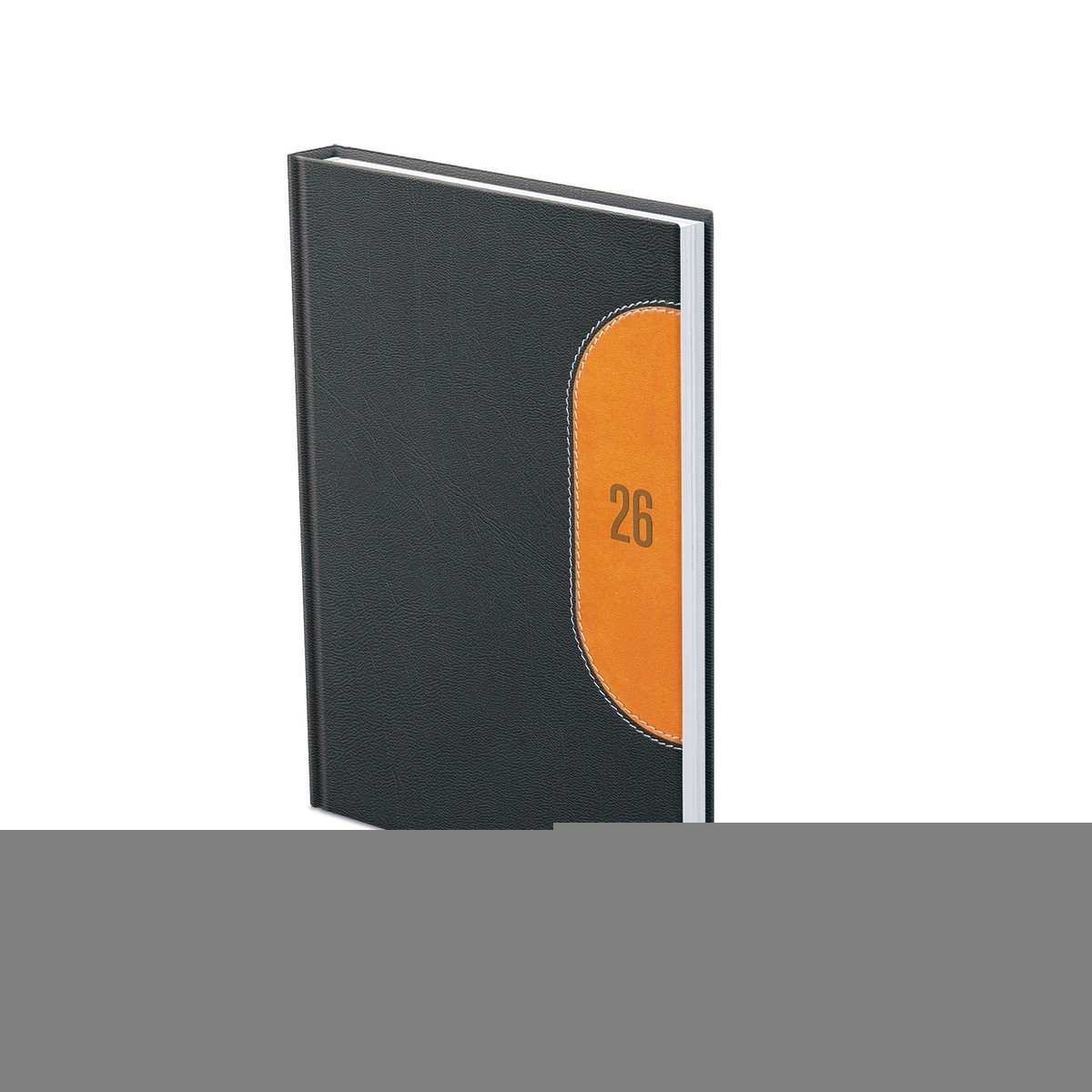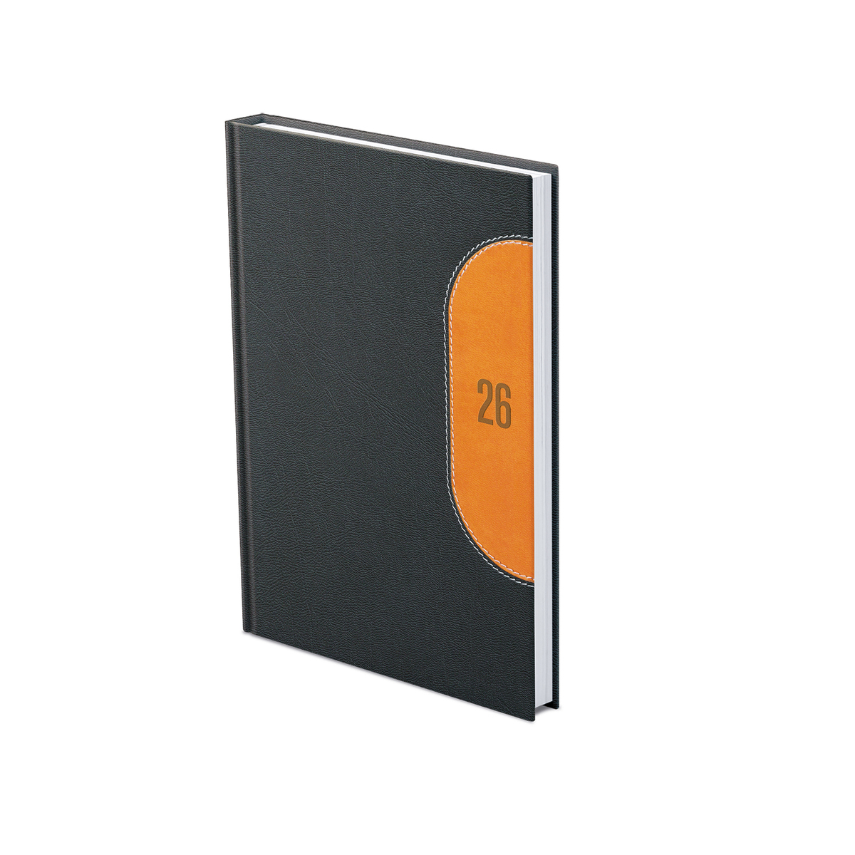 Kétféle, matt bőrhatású, hőre színeződő műbőrből, különleges varrott betéttel díszített, fehér tömbös, heti beosztású naptár, jelzőszalaggal és sarokperforációval. Színes térképet tartalmaz.