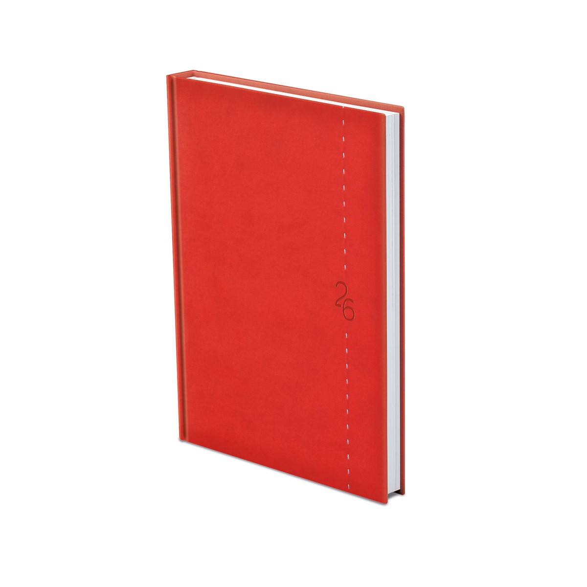 Matt, bőrhatású, hőre színeződő műbőr bevonóval, függőleges dísztűzéssel készült, fehér tömbös, heti beosztású naptár, jelzőszalaggal és sarokperforációval. Elöl-hátul szivacsos fedlap. Színes térképet tartalmaz.