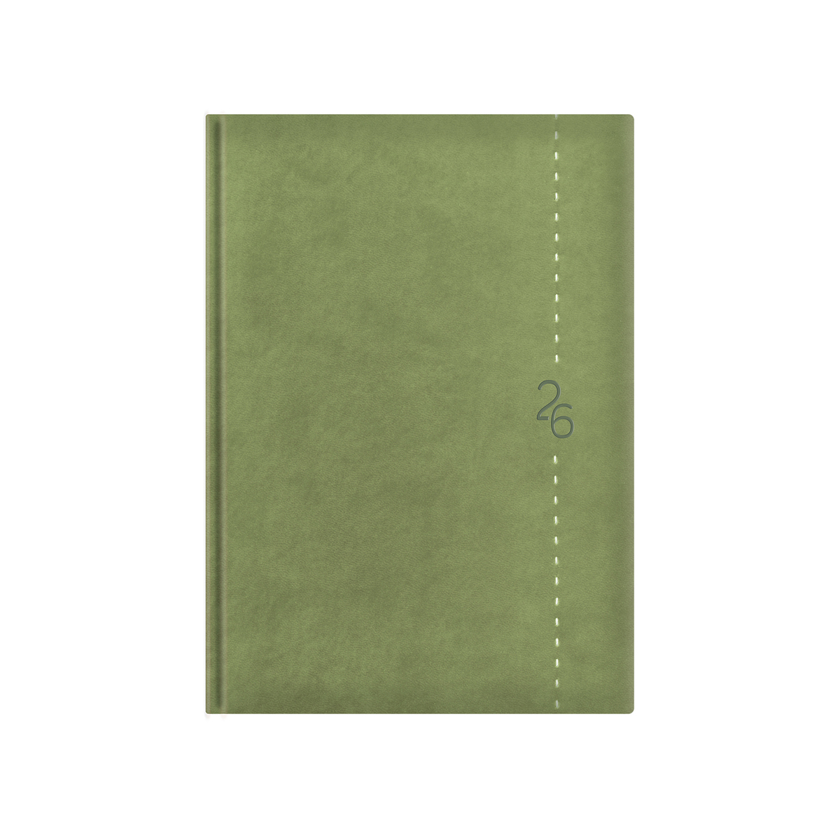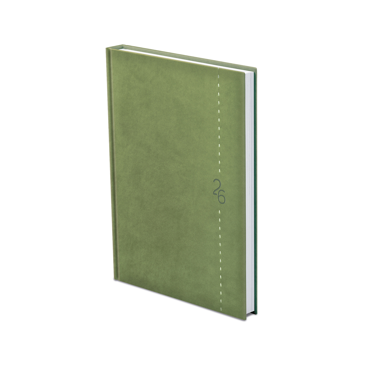 Matt, bőrhatású, hőre színeződő műbőr bevonóval, függőleges dísztűzéssel készült, fehér tömbös, heti beosztású naptár, jelzőszalaggal és sarokperforációval. Elöl-hátul szivacsos fedlap. Színes térképet tartalmaz.