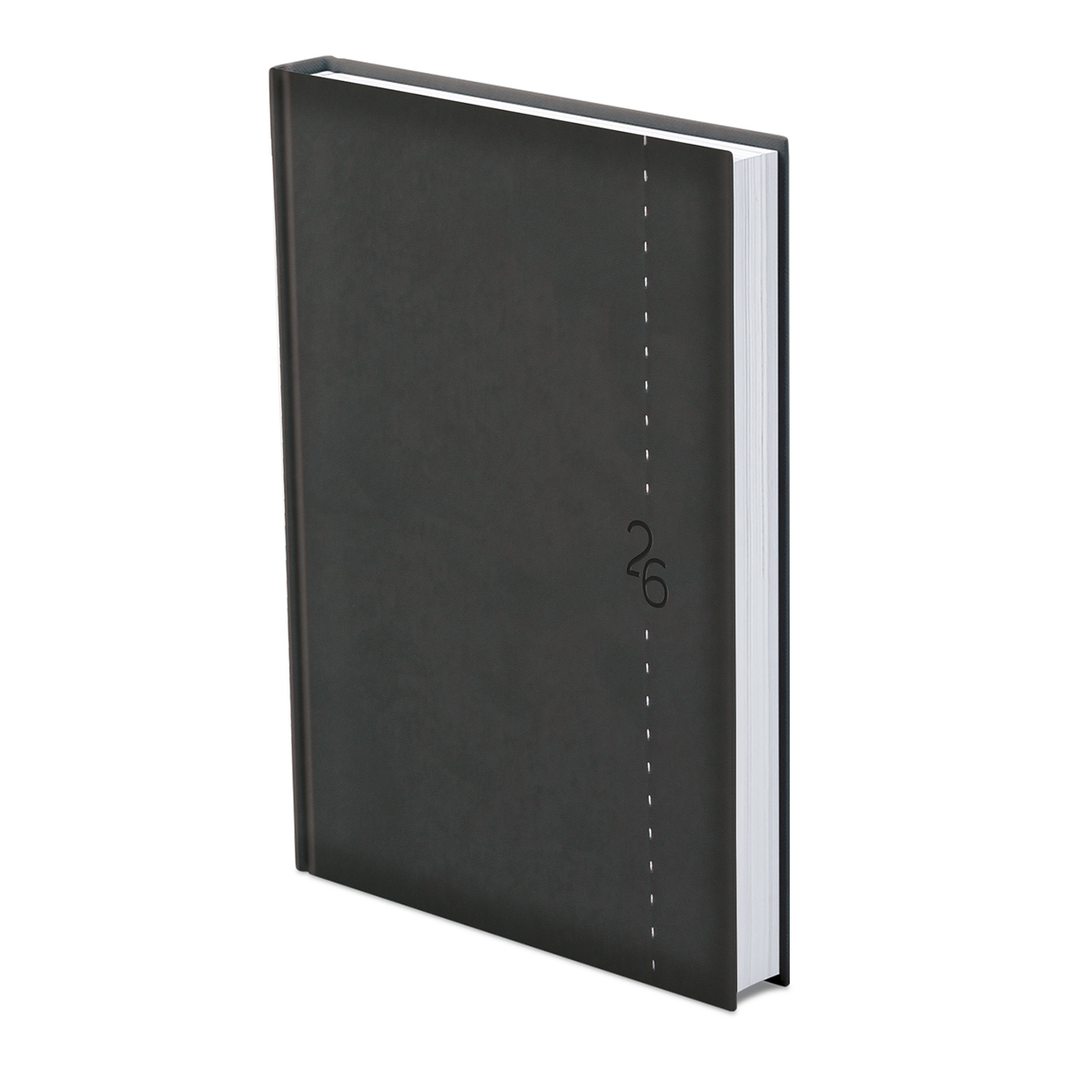 Matt, bőrhatású, hőre színeződő műbőr bevonóval, függőleges dísztűzéssel készült, fehér tömbös napi beosztású naptár, jelzőszalaggal és sarokperforációval. Elöl-hátul szivacsos fedlap. Színes térképet tartalmaz.