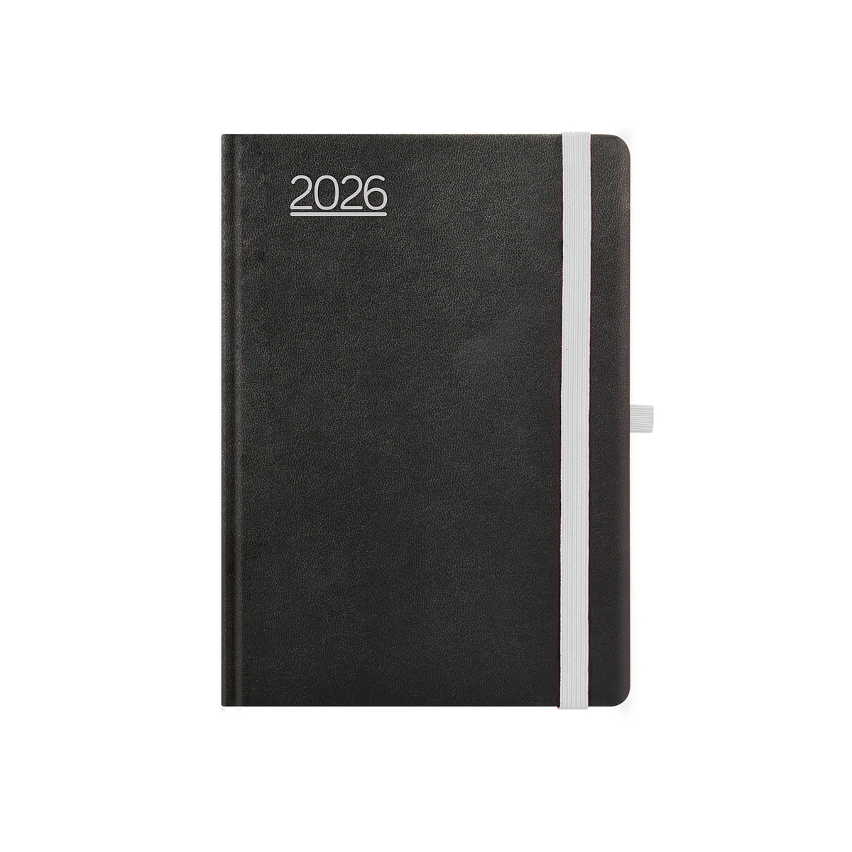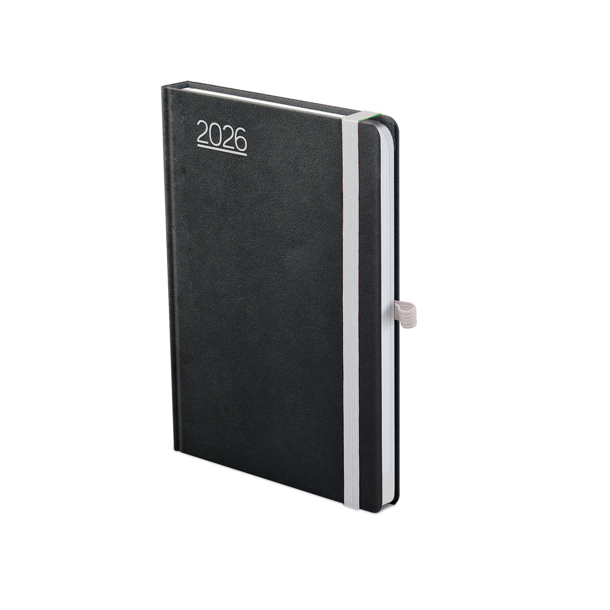 Fényes műbőr bevonóval, az átfogó gumiszalag színével megegyező évszámmal, tolltartóval, és sarokkerekítéssel készített, fehér tömbös, heti beosztású naptár, a gumiszalag színével harmonizáló oromszegővel, jelzőszalaggal és sarokperforációval. Színes térképet tartalmaz.