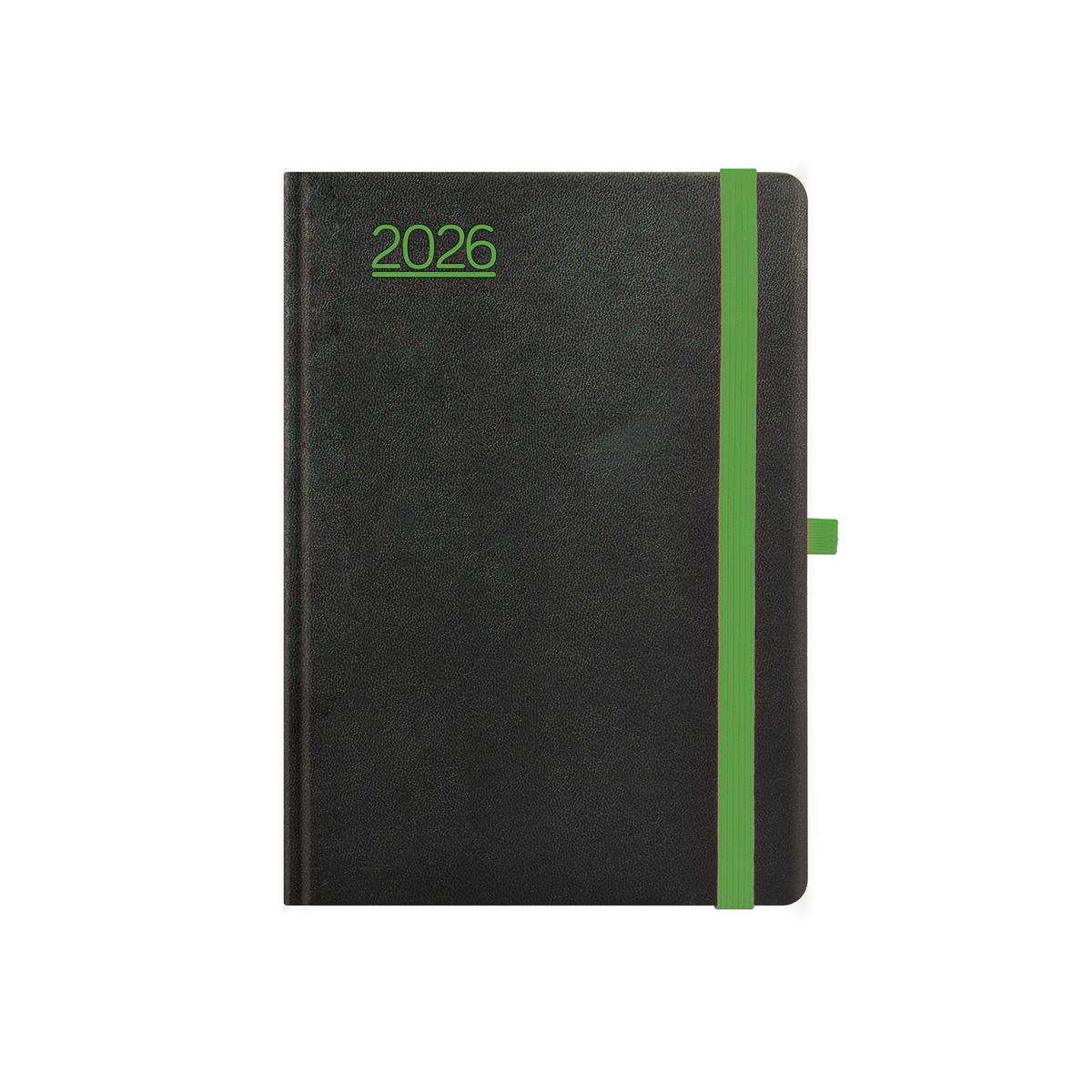 Fényes műbőr bevonóval, az átfogó gumiszalag színével megegyező évszámmal, tolltartóval, és sarokkerekítéssel készített, fehér tömbös, heti beosztású naptár, a gumiszalag színével harmonizáló oromszegővel, jelzőszalaggal és sarokperforációval. Színes térképet tartalmaz.