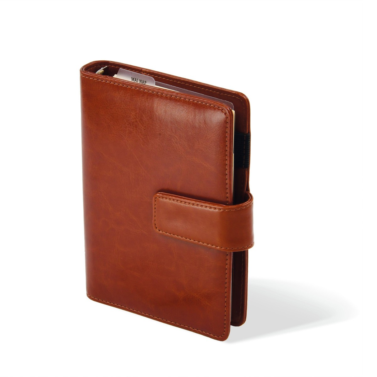 Modern vonalvezetésű, valódi bőr hatású, rejtett mágnessel záródó, kiváló minőségű műbőr, krém (Chamois) betétlapokkal töltött kalendárium.