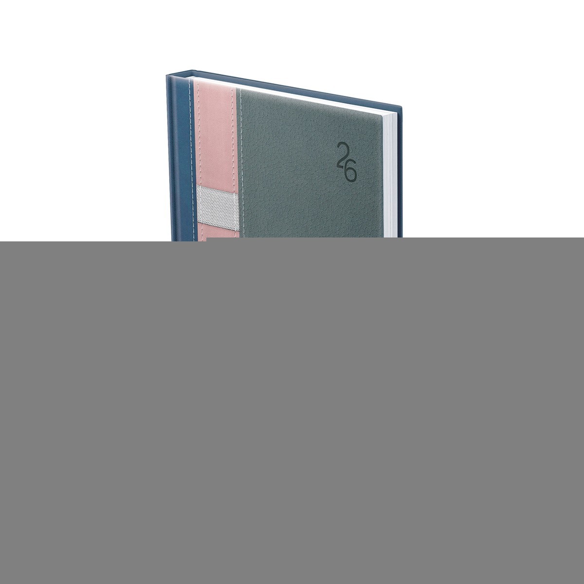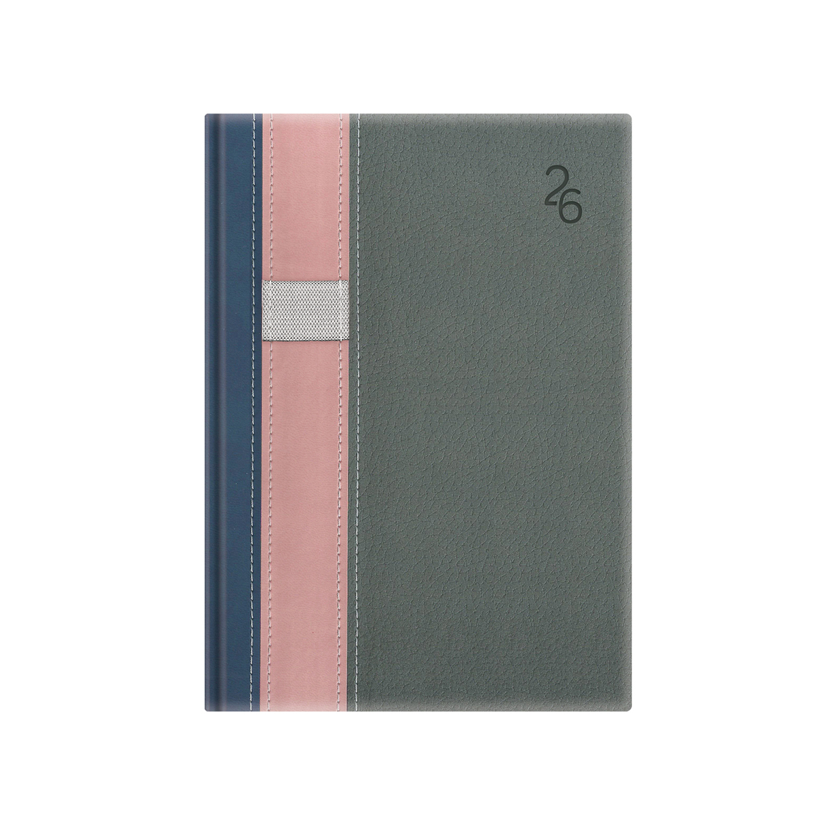 Kétféle, matt, bőrhatású és eltérő felületű, hőre színeződő műbőr bevonóval, varrással díszitett, gumis tolltartóval ellátott, fehér tömbös, heti beosztású naptár, jelzőszalaggal. Színes térképet tartalmaz.