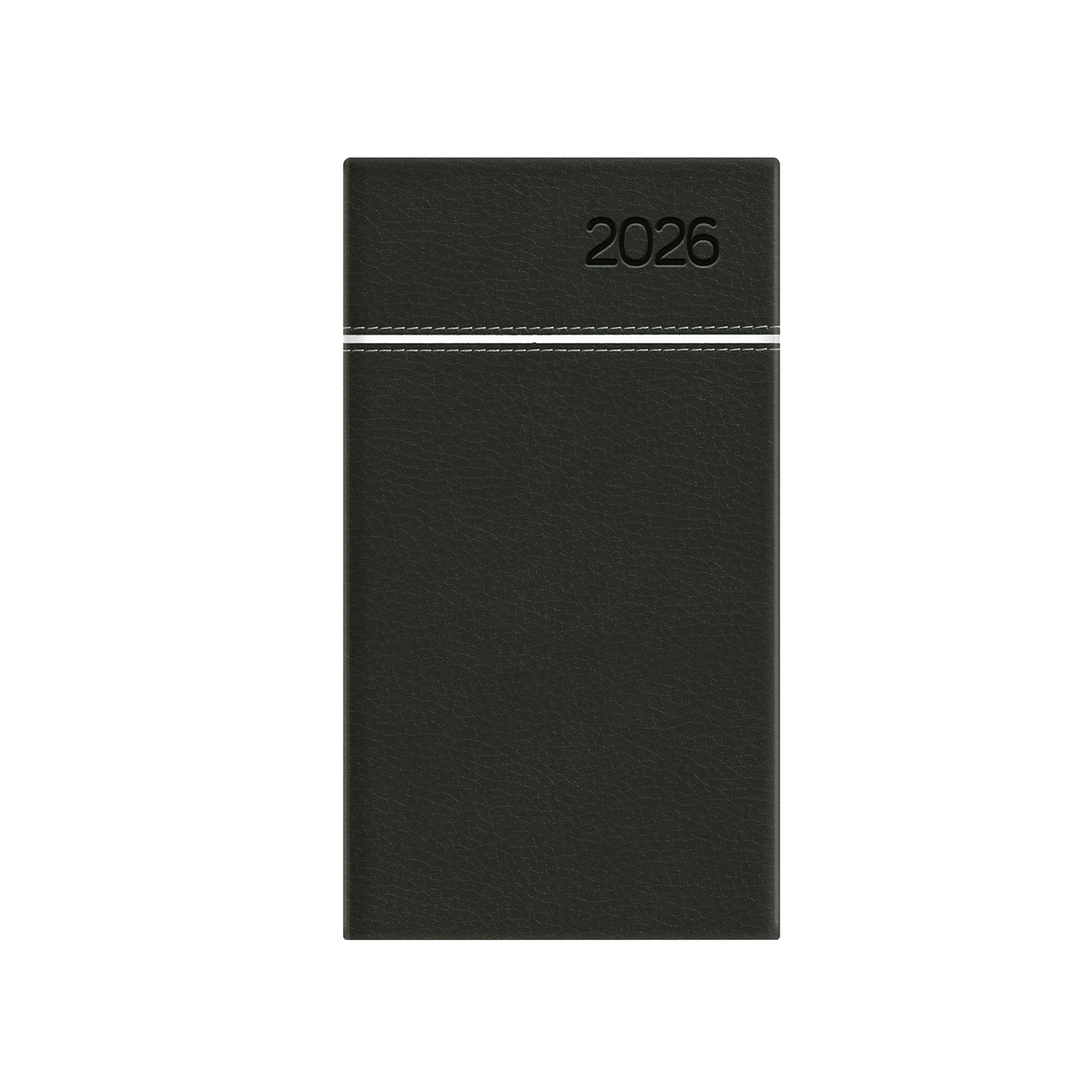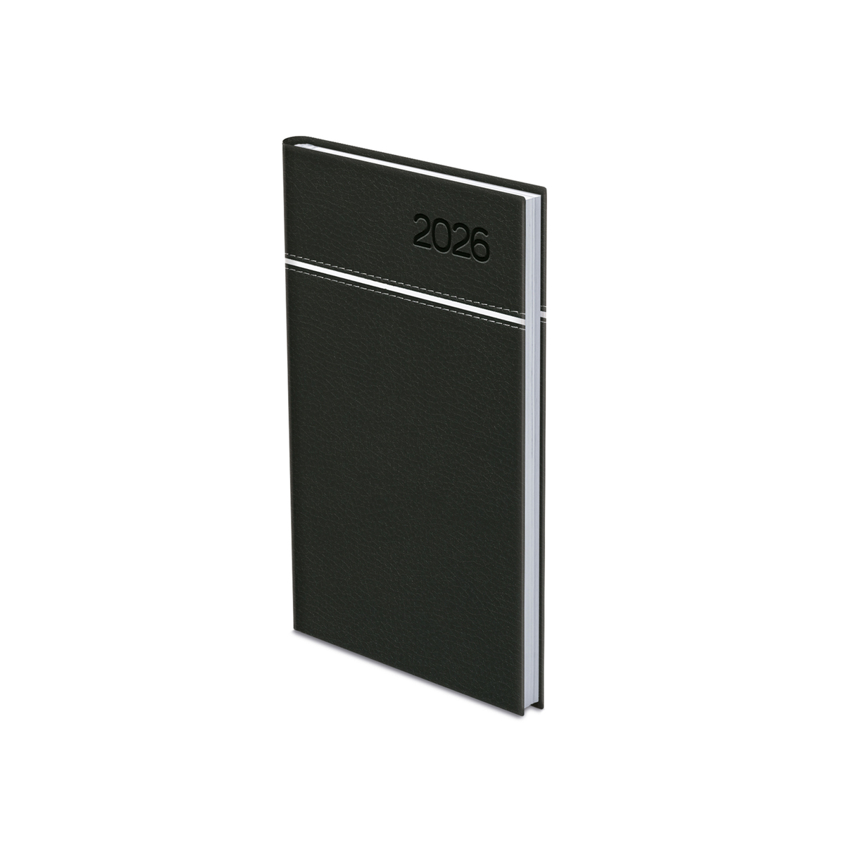 Matt, bőrhatású, hőre színeződő műbőr bevonóval, vízszintes díszítő csík bevarrásával készült, fehér tömbös álló zsebnaptár, jelzőszalaggal. Színes térképet tartalmaz.