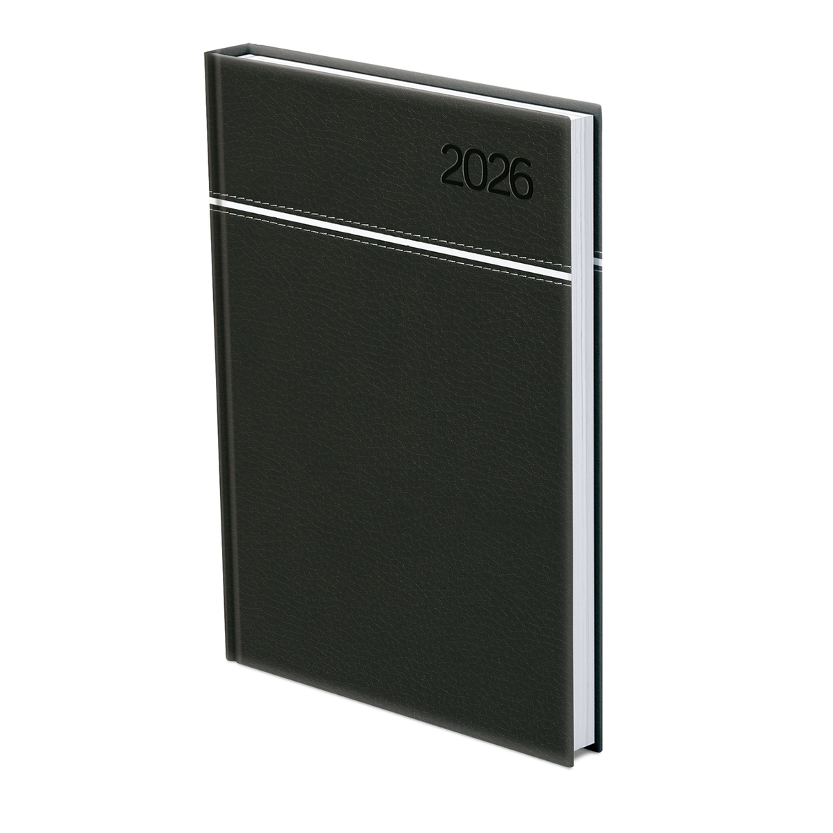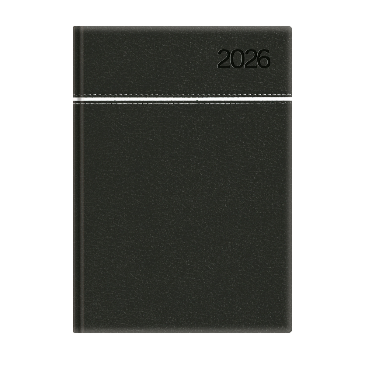 Matt, bőrhatású, hőre színeződő műbőr bevonóval, vízszintes díszítő csík bevarrásával készült, fehér tömbös heti beosztású naptár, jelzőszalaggal és sarokperforációval. Elöl-hátul szivacsos fedlap. Színes térképet tartalmaz.